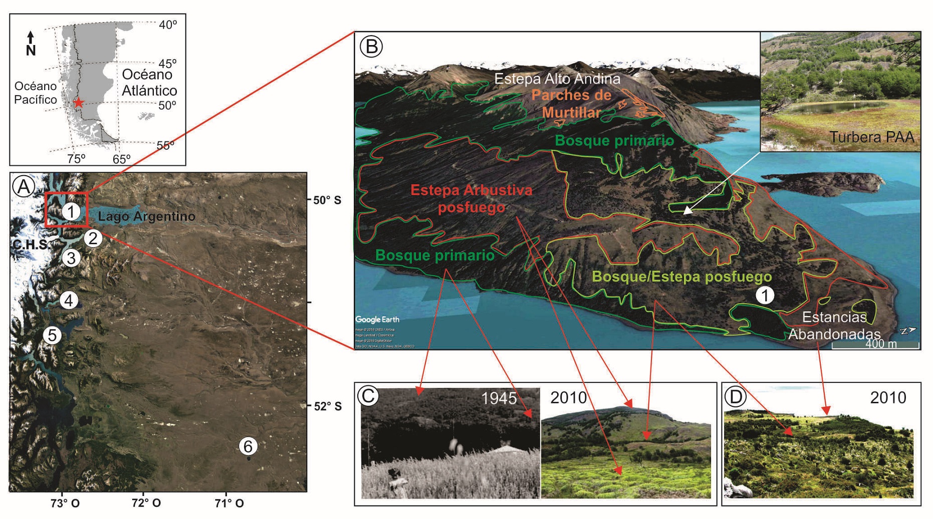 Este trabajo tiene como objetivo reconstruir los cambios en la vegetación y en los patrones de diversidad vegetal durante los últimos ca. 12.000 años cal AP en relación con la dinámica posglacial, de disturbios naturales y antrópicos en la cuenca del lago Argentino. Para ello, en primer lugar se presenta un modelo de representación polínica actual del gradiente de vegetación altitudinal, y luego el análisis del registro polínico y de carbón vegetal sedimentario de una secuencia de turbera localizada en la península Avellaneda (Parque Nacional Los Glaciares, Santa Cruz). Las inferencias paleoambientales a partir de este sitio son discutidas en el contexto de otras reconstrucciones existentes para la cuenca del lago Argentino (Fig. 1).