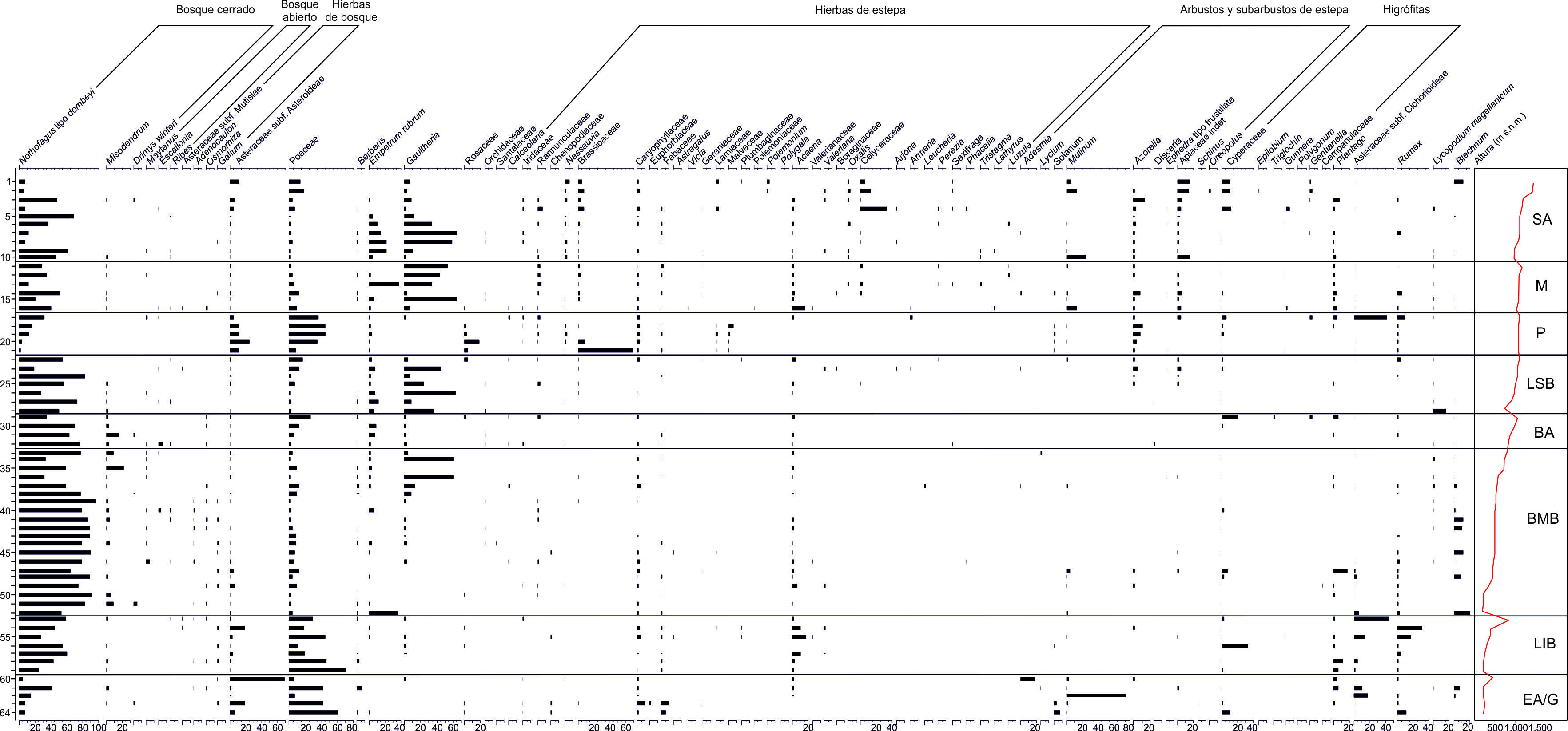 El porcentaje de los taxones se calculó a partir de 3 sumas. La primera suma “Polen” incluyó a los taxones indicadores de bosque cerrado y bosque abierto (Nothofagus tipo dombeyi, Misodendrum, Drymiswinteri, Maytenus, Escallonia, Ribes), hierbas de bosque (Asteraceae subf. Mutisiae, Adenocaulon, Osmorhiza, Galium), hierbas de estepa (Calceolaria, Iridaceae, Ranunculaceae, Chenopodiaceae, Nassauvia, Brassicaceae, Caryophyllaceae, Euphorbiaceae, Fabaceae, Astragalus, Vicia, Geraniaceae, Lamiaceae, Malvaceae, Plumbaginaceae, Polemoniaceae, Polemonium, Polygala, Acaena, Valerianaceae, Valeriana, Boraginaceae, Oxalis, Calyceraceae, Arjona, Armeria, Leucheria, Perezia, Saxifraga, Phacelia, Tristagma, Lathyrus y Luzula), arbustos y subarbustos de estepa (Adesmia, Lycium, Solanum, Mulinum, Azorella, Discaria, Ephedra tipo frustillata, Apiaceae, Schinus, Oreopolus), higrófitas (Cyperaceae, Epilobium, Triglochin, Gunnera, Polygonum, Gentianella, Campanulaceae), Asteraceae subf. Asteroideae, Poaceae, Berberis, Empetrumrubrum, Gaultheria, Rosaceae, Orchidaceae y Santalaceae. La segunda suma “Total” incluyó, además de la suma “Polen”, a Plantago, Asteraceae subf. Cichorioideae y Rumexel porcentaje de esporas (Lycopodium magellanicum y Blechnum) se cuantificó a partir de la suma “Total” + Esporas. Los gráficos se realizaron con el programa TILIA.GRAPH (TGView 2.0.2; Grimm, 2004).