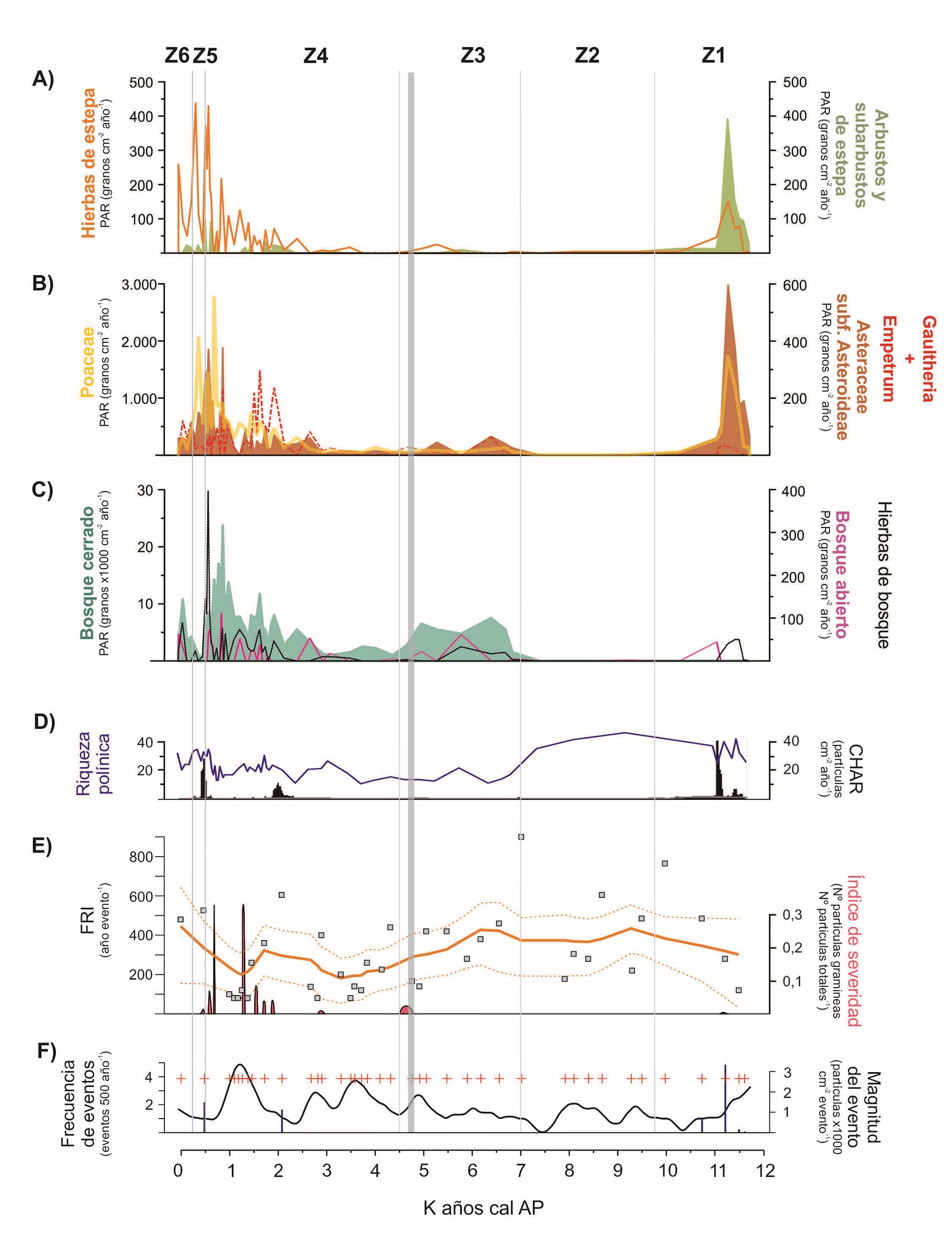 El régimen de incendios presenta una variabilidad que ha acompañado los cambios en el registro polínico fósil. En términos generales, el intervalo libre de incendios osciló los 350-400 años, entre el comienzo de la secuencia hasta ca. 6.500 años cal AP (zonas 1 y 2, Fig. 6E). A partir de ese momento en simultáneo con un espectro polínico que sugiere el pasaje de comunidades esteparias a bosques cerrados, se registra un aumento gradual en la frecuencia de incendios (Fig. 6F) con períodos de mayor frecuencia ca. 3.500 y 1.200 años cal AP. El índice de severidad muestra una dominancia de incendios con un alto componente leñoso durante gran parte del registro a excepción de los incendios ocurridos durante los últimos 2.000 años (Fig. 6E). Este patrón coincide con los altos valores de PAR de Poaceae y de hierbas de estepa registrados para este período. Los incendios de mayor magnitud se corresponden con períodos de baja frecuencia de incendios (o altos intervalos libres de incendios). Durante el último milenio, se registra una disminución abrupta de los valores de Nothofagus, en términos de porcentaje y PAR, ca. 500 años cal AP y por el contrario, un incremento de indicadores herbáceos. Estos cambios coinciden con la ocurrencia de un evento de fuego de gran magnitud (1.501 partículas cm-2 por evento-1, Fig. 6F). El evento de fuego más reciente es registrado ca. 1.950 A.D. con una magnitud de 33,7 partículas cm-2 evento -1 (Fig. 6F). La coincidencia entre el registro documental de los incendios ocurridos en la península Avellaneda y la detección estadística de este evento de fuego a partir del análisis de partículas de carbón vegetal sedimentario refuerzan la validez de este indicador para la reconstrucción del Paleorrégimen de incendios. En términos generales, los intervalos libres de fuego altos (350-400 años) coinciden con la inferencia de tipos de vegetación abierta y riqueza palinológica alta. Los patrones de consumo de biomasa siguen el siguiente orden (de mayor a menor) y similitud: zona 1=zona 5˃zona 6˃zona 3=zona 4˃zona 2 (Fig. 7). Las zonas con valores más altos de CHAR (zonas 1 y 5), concuerdan con los altos valores de PAR de Asteraceae subf. Asteroideae, Poaceae, hierbas, arbustos y subarbustos de estepa. Por el contrario la zona 2 presenta valores de CHAR nulos en sintonía con los valores más bajos de PAR de todos los taxones.