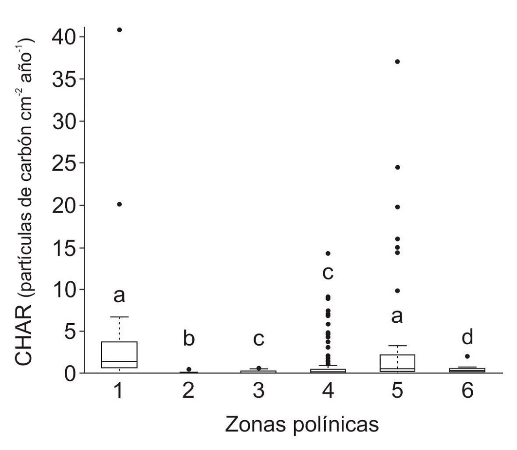 FIG. 7. Diagrama de caja (Boxplot) de valores de CHAR graficados por zonas polínicas. Las distintas letras presentan diferencias significativas entre zonas (p˂0,05). Las cajas representan el cuartil superior e inferior y la línea central el valor mediano de CHAR. Las zonas polínicas (1 a 6) son las mismas identificadas en la figura 5 y representadas en la figura 6.