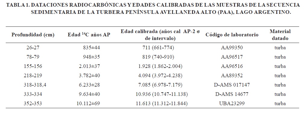 La cronología de la secuencia sedimentaria Península Avellaneda Alto se basa en siete dataciones radiocarbónicas AMS (espectrometría de masas con aceleradores) de diferentes niveles de la secuencia (Tabla 1). Se utilizó el programa CALIB software (Stuiver et al., 2005) y la curva de calibración del Hemisferio Sur (SHCal13)(Hogg et al., 2013) para expresar edades 14C como años calibrados antes del presente (años cal AP). Se elaboró un modelo de edad-profundidad del tipo bayesiano, con la asistencia del paquete “Bacon” del programa R (Blaauw y Christen, 2011). La capa de ceniza presente entre 228 y 290 cm fue considerada como una depositación instantánea en términos geológicos.