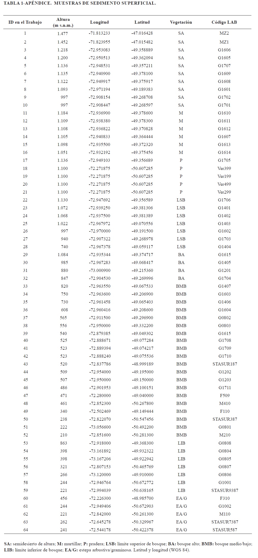 TABLA 1-APÉNDICE. MUESTRAS DE SEDIMENTO SUPERFICIAL.