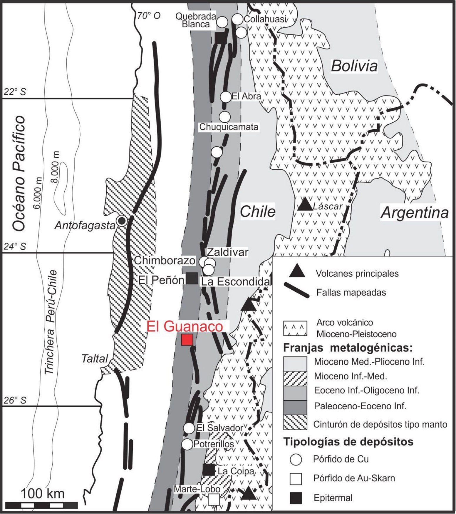 Fig. 1. El yacimiento de oro El Guanaco se localiza 215 km al sureste de la ciudad de Antofagasta y forma parte de la franja metalogénica del Paleoceno-Eoceno Inferior compuesta por yacimientos tipo pórfido de cobre y epitermales de metales preciosos. Se señalan los grandes sistemas estructurales del norte de Chile, Sistemas de Fallas Atacama y de Domeyko, a la izquierda y derecha respectivamente (Modificado de Richards, 2003).