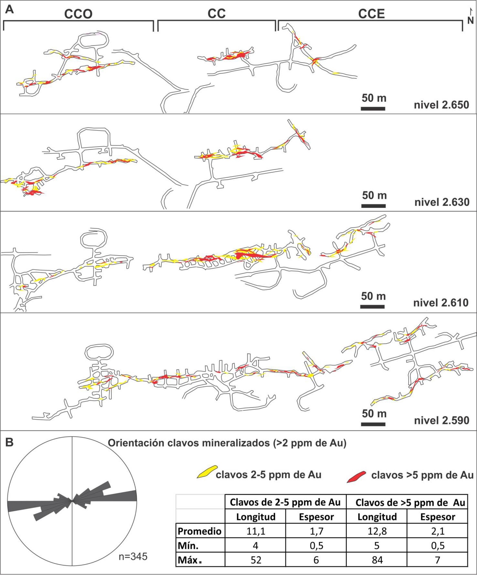 Los sectores con leyes entre 2 y 5 g/t de Au son zonas aledañas a los clavos, >5g/t de Au y se desarrollan en ambas orientaciones (EO y ENE). Son más frecuentes en la orientación ENE, formando segmentos poco continuos y de poca longitud (longitud promedio de 11 m y espesor promedio de 1,7 m; Fig. 6A y B). En general forman halos alrededor de los sectores con leyes >5 g/t de Au.