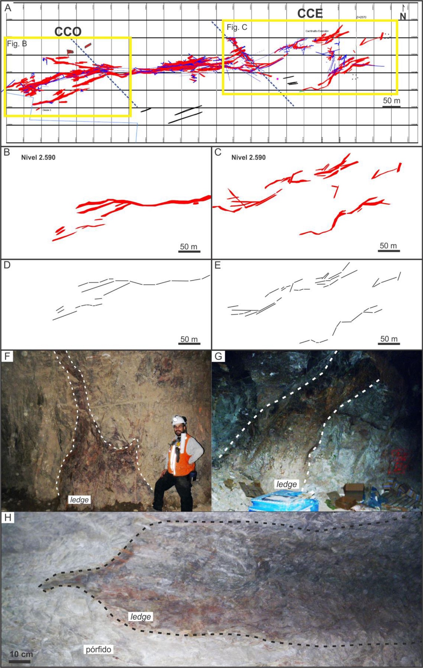 El análisis estadístico de los ledges permitió visualizar el desarrollo de sus orientaciones principales: EO, ENE-OSO (incluyendo NE-SO) y en menor medida ONO-ESE (Fig. 5B). Los segmentos de ledges de mayor frecuencia son los de orientación EO, con rumbos que varían entre N90° y N80° (promedio N89°). Se caracterizan por ser continuos, con espesores de hasta 12 m, pero con promedio de 3 m, e inclinaciones de más de 75°, generalmente al NO. La longitud de estos segmentos principales varía entre los 10 y 90 m, con un promedio de 36 m (Figs. 7 y 8). En el sector de Cachinalito Central (Figs. 7A y 8A a C) se puede reconocer que los ledges tienen una orientación dominante EO, pero internamente se encuentran segmentados con estructuras que van cambiando de orientación desde EO a ENE y localmente ONO (Fig. 8D y E). En los frentes de interior mina se observan algunos ledges con espesores cercanos a los 2 m acompañados en su bordes por una zona constituida por delgados ledges subparalelos, junto con vetillas de óxidos de Fe supérgeno (Fig. 8F y G). Indicadores cinemáticos (estrías, corrugados y escalones) medidos en planos de los ledges EO muestran raques de alto ángulo (>75°) con componente dextral, y un fuerte componente normal indicado por escalones estriados.