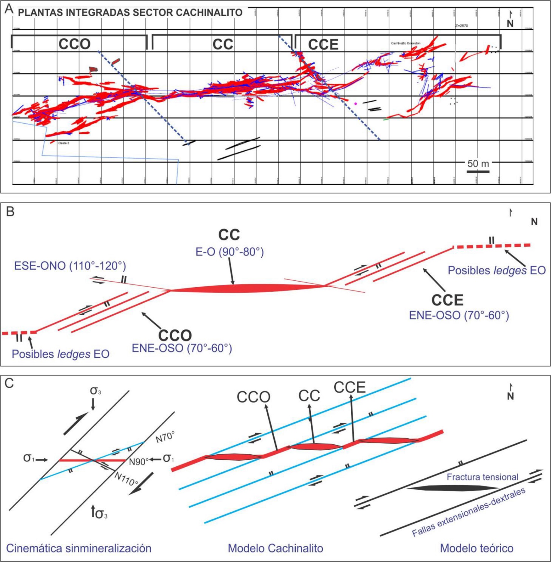 El sistema de ledges del sector Cachinalito presenta una morfología discontinua, de orientación general ENE-OSO, conformada por tramos que cambian abruptamente de dirección, espesor, longitud y/o inclinación en pocos metros de corrida. Ellos definen una estructura sigmoidal, generada a partir del crecimiento de fallas por donde circularon los fluidos hidrotermales responsables de la génesis del yacimiento. De acuerdo con los antecedentes de campo (Figs. 4 y 7), la distribución espacial de los ledges está directamente asociada con las fallas y fracturas (Fig. 4). Las relaciones de corte entre las fallas, rocas de caja (56-52 Ma) y edad de la actividad hidrotermal (43-49 Ma) permiten sugerir la contemporaneidad entre la actividad de las fallas y el proceso mineralizador. En este contexto, estas estructuras habrían canalizado la circulación de los fluidos hidrotermales y, al mismo tiempo, habrían continuado su actividad tectónica durante la formación del yacimiento, como queda registrado en los indicadores cinemáticos presentes en los ledges, situación ampliamente documentada para este tipo de depósito (Cox et al., 2001; Nelson, 2006).
