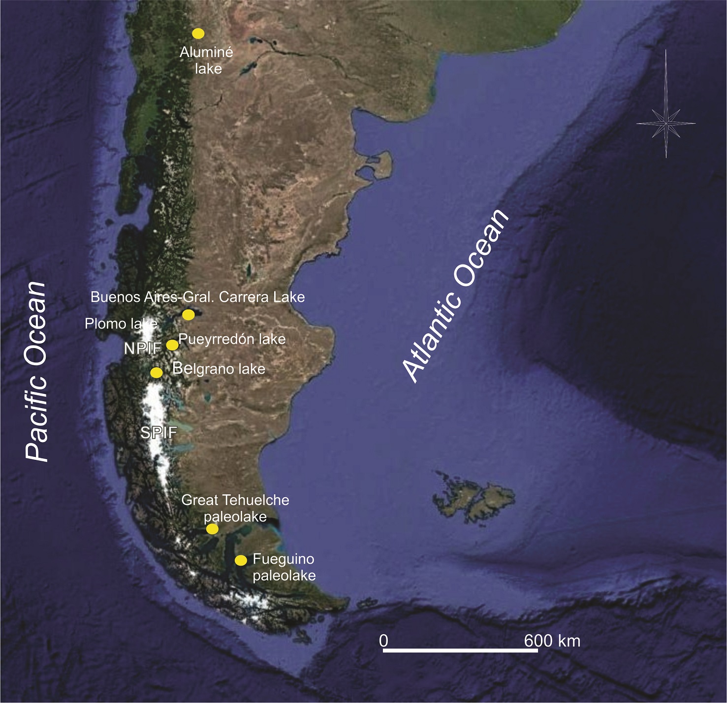 Fig. 1. Location of the lacustrine complexes mentioned in the text. NPIF: Northern Patagonian Ice Field; SPIF: Southern Patagonian Ice Field.