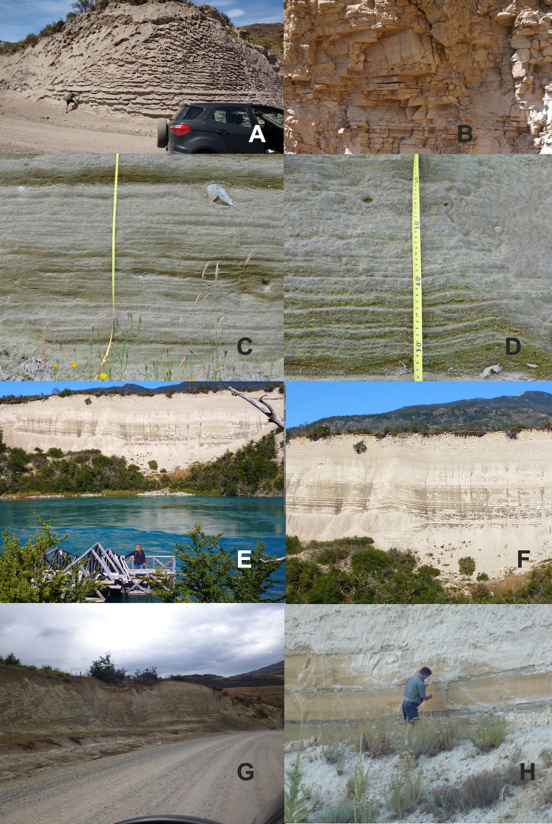 Fig. 5. Chilean glaciolacustrine sequences. From N to S: A. Fachinal; B. Detail of the varves; C. Bertrand Lake; D. Detail; E. Baker River profile; F. Detail; G. Chacabuco River; H. Detail.