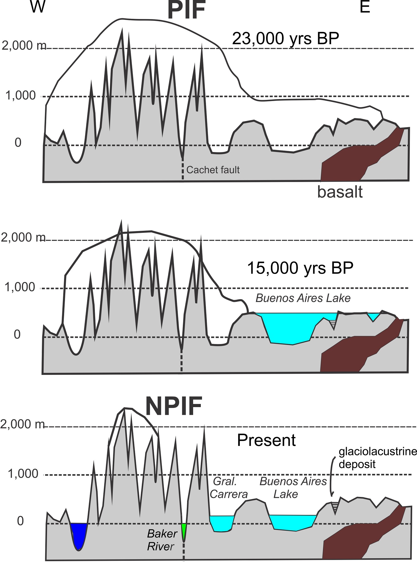 The basaltic extrusions and intrusions occurred during the last 3 Ma conditioned the morphology where the glaciers were limited to flow (Lagabrielle et al., 2010). Lava deposits of Upper Pleistocene age were reported to the east of Buenos Aires Lake (Ton-That et al., 1999). These deposits caused that some Argentine rivers (Pinturas, Deseado) diminished significantly their watersheds. As consequence the Baker River incorporated stepwise several lakes in its watershed about 10 kyrs, and led to the progradation of its delta system close to Caleta Tortel (Isla et al., 2015). An evolution model of these steps in the retreat of the ice fronts and lake level drops has been proposed based on digital elevation models (Fig. 7). A fault oriented N-S was mapped at the Eastern border of the present NPIF (Cachet Fault). This block is assumed to move towards the north (Georgieva et al., 2016). The final stages of the drainage of the General Carrera-Buenos Aires Lake system has been reported with the catastrophic flooding of the Baker River about 10,000 yrs BP (Thorndycraft et al., 2019; Davies et al., 2020). Other glacial lake outburst floods (GLOFs) have occurred recently along the Baker (Ulloa et al., 2018) and Exploradores rivers (Bañales-Seguel et al., 2020). Recent GLOFs are of special concern in relation to the historic mountain-glacier contributions to the sea level (Zemp et al., 2019)
