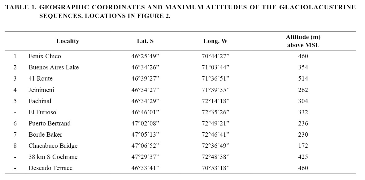 At the Argentine side, the maximum altitude of the glaciolacustrine sequences diminishes towards the west. At the Chilean side, the altitudes of the former lake levels diminish northwards (Fig. 2). At the Argentine territory the altitudes are higher as the distances to the present lakes increase. The highest levels are at about 500 m over MSL suggesting the maximum extension of the largest paleolake.