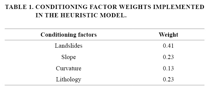 The heuristic model requires on the one hand, a weight for each conditioning factor and the sum of all is one while on the other; each factor has a susceptibility score, which in the case of this study can assume values of one, two or three, as explained above. The final implementation of the model consists of a weighted sum of the susceptibility scores of the conditioning factors as follows: