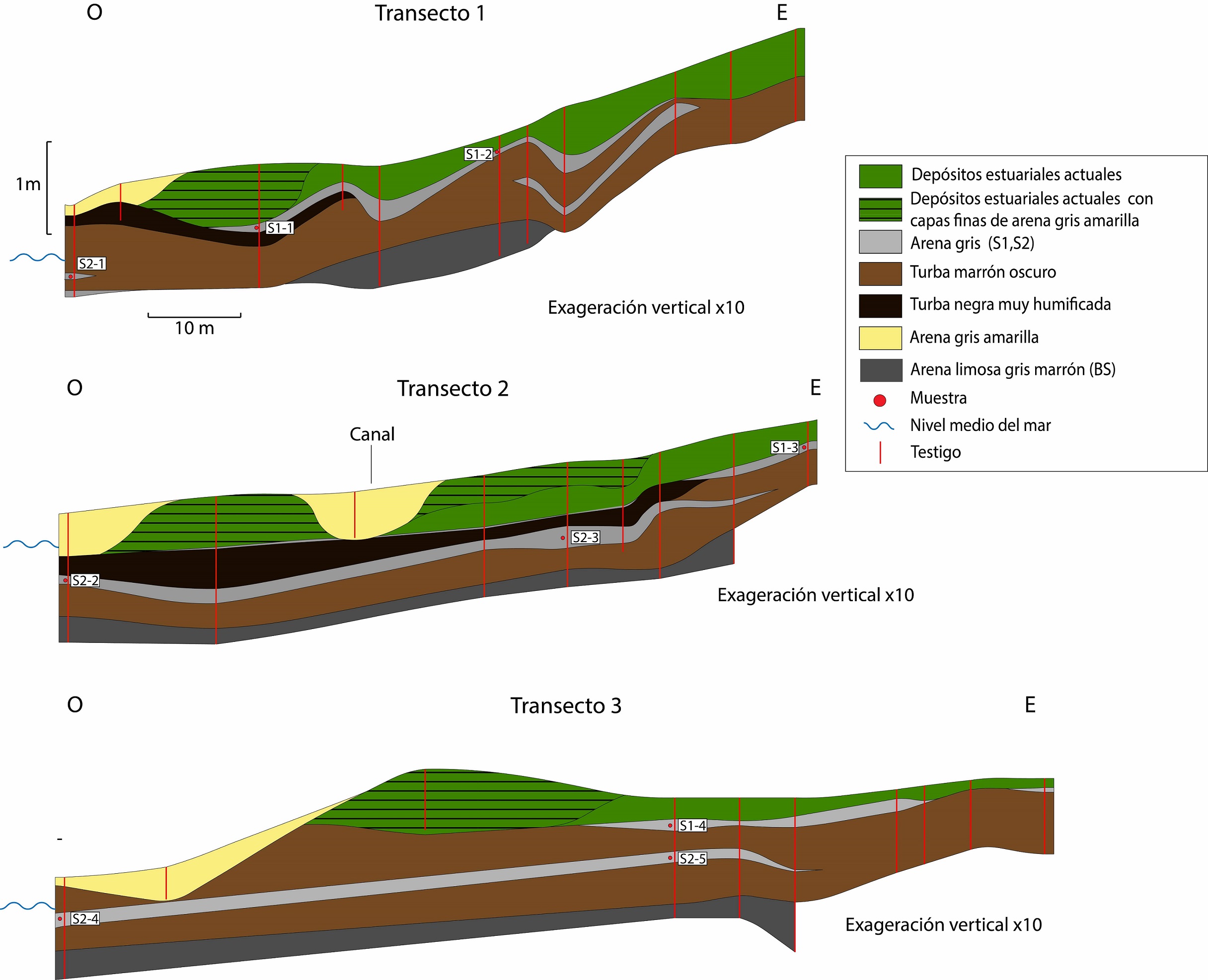 De acuerdo con los perfiles elaborados (Fig. 4), las capas de arena S1y S2 se encuentran ampliamente distribuidas dentro de la marisma, y a pesar de que su espesor tiende a disminuir hacia el este (hacia el continente) tanto en los transectos 1, 3, 5 y 6 para S1 como en los 2 y 3 para S2 (Fig. 2), no resulta ser una tendencia generalizada dentro del área estudiada. La distribución de S3 es más localizada y se concentra en la porción sur del transecto 4. Por otra parte, es común encontrar depósitos estuariales actuales intercalados con finas capas de arena en las zonas más cercanas al nivel relativo del mar de todos los transectos en sentido O-E y dentro del transecto 4 en sentido N-S (Fig. 2).