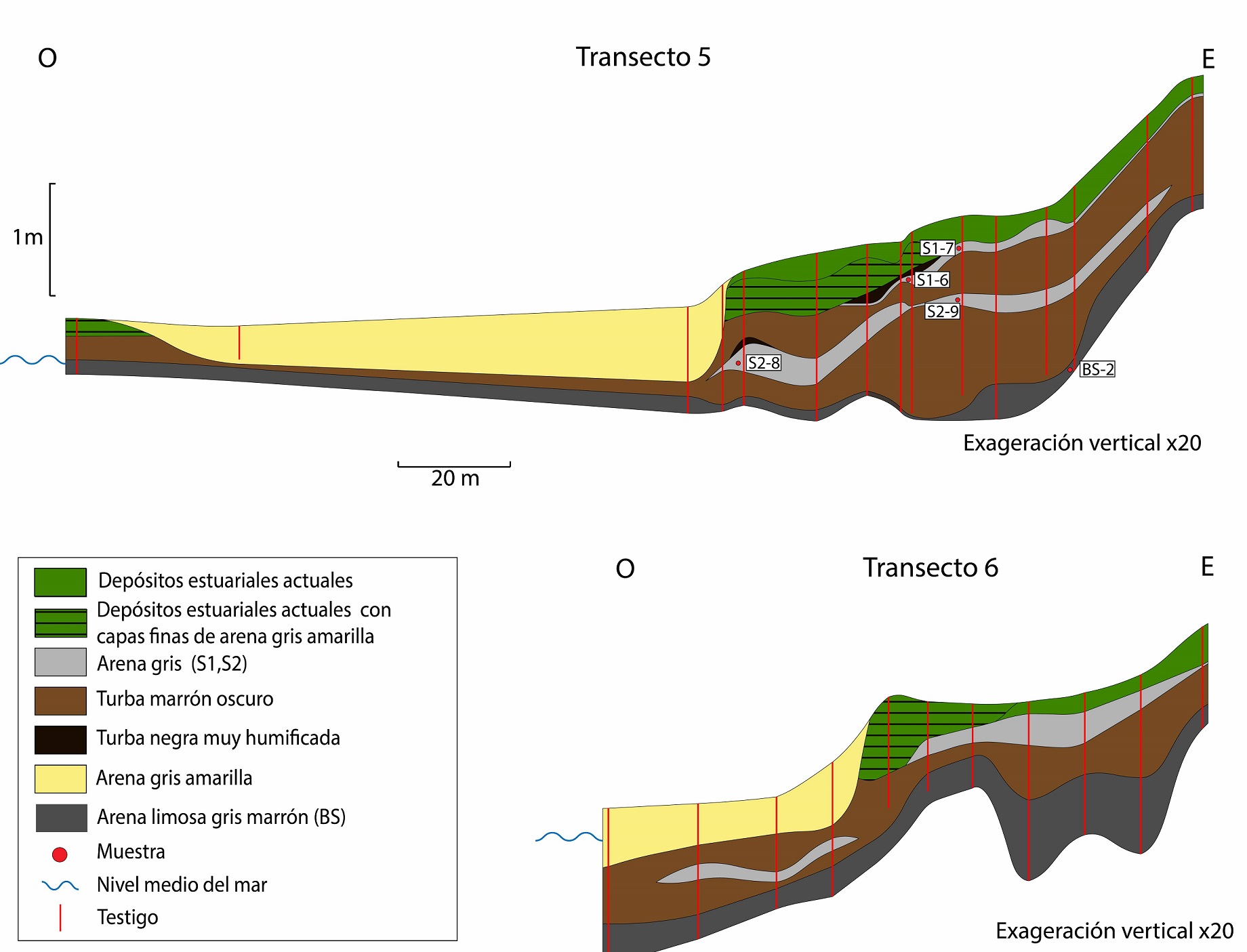 Con la información recogida en los testigos se elaboraron 7 secciones, en donde las diferentes capas se relacionaron entre sí, con base en sus características sedimentológicas, altura y espesor, para establecer su continuidad y distribución dentro de la marisma. De esta manera se definieron 4 capas de arena: S1, S2, S3 y BS (de más reciente a más antigua), que presentan continuidad dentro de la superficie estudiada.