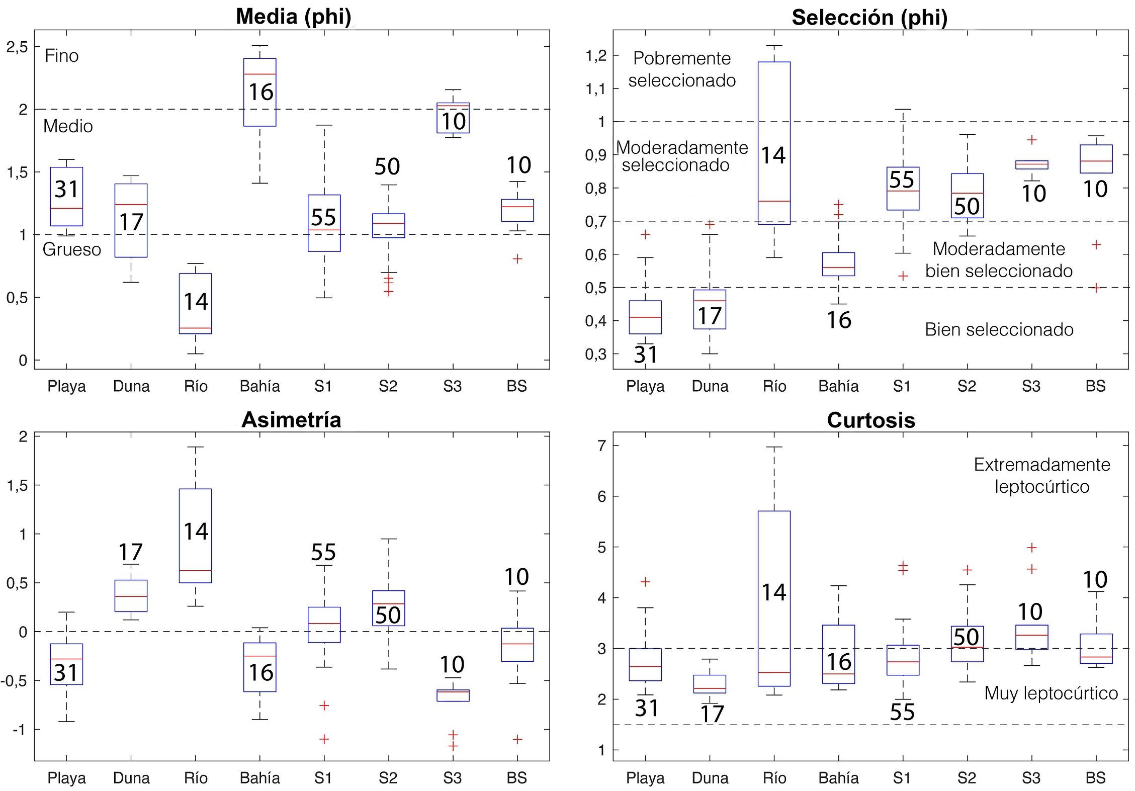 En cuanto a la selección se aprecia que tanto las muestras de playa como las de dunas tienen una buena selección (<0,5 phi), las de bahía presentan valores ligeramente menores (0,5-0,7 phi), mientras que las demás se distribuyen mayoritariamente en un rango de selección moderada (0,7-1 phi). Por otra parte, las muestras de playa, bahía, S3 y BS son negativamente asimétricas, en tanto que las de dunas, río, S1 y S2 presentan asimetría positiva. Finalmente se observa que las muestras se distribuyen desde muy leptocúrticas a extremadamente leptocúrticas. Cabe señalar que las muestras de río presentan una dispersión notoria, sobre todo en los parámetros de selección y curtosis.