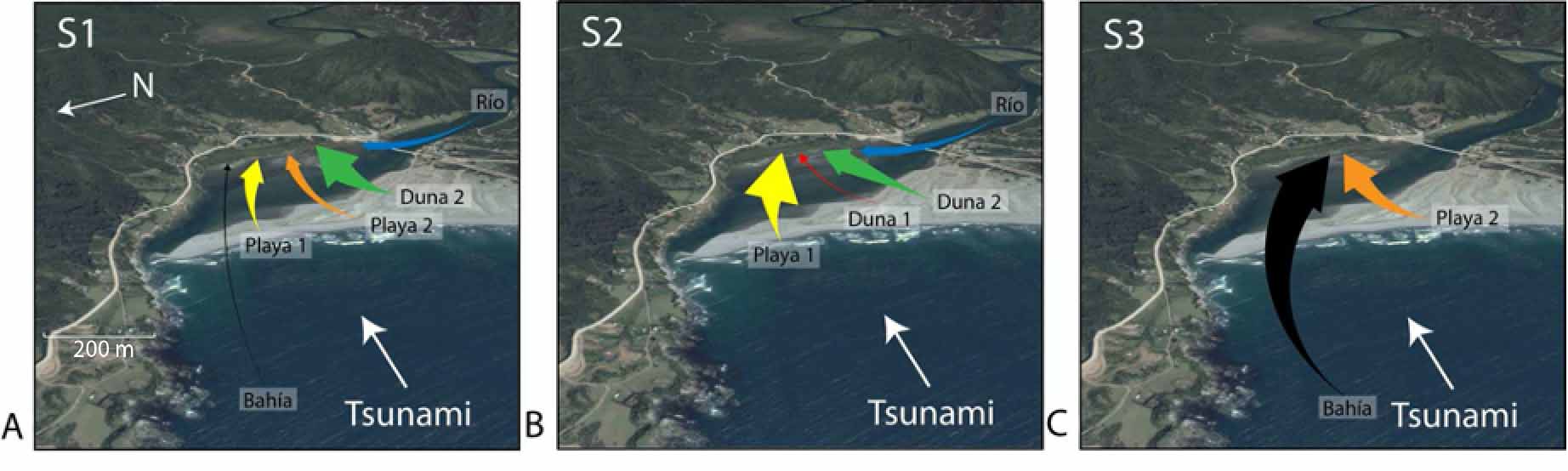 El análisis discriminante logra establecer una base estadística entre los distintos tipos de sedimentos considerados en este estudio (Tabla 1), sugiriendo que las capas de la marisma y los ambientes modernos tienen correlación. Las capas de arena S1 y S2 están relacionadas casi totalmente con los ambientes de duna y playa, en particular con la fracción más gruesa de ellas, con una contribución menor de parte del río (Fig. 7). Esto concuerda bien con la depositación de arena que se produciría dentro de la marisma en Chaihuín durante un tsunami. Lo anterior se debe a que antes de que la ola alcance esa área es necesario que pase por encima de la barra y parte de la playa y las dunas del sector erosionando, transportando parte de ese sedimento (Fig. 8A y B). Bajo este mecanismo, también sería esperable la presencia de una pequeña porción de granos asociados al río (como es el caso) y la bahía. Sin embargo, la asociación de estas capas con dicho tipo de ambiente es casi nula, probablemente debido a que, si existió sedimento proveniente de allí, correspondería a la fracción más fina que es fácilmente transportable por agentes comunes en la zona como la lluvia, tal como fue reportado en Tailandia (Szczuciński, 2012).