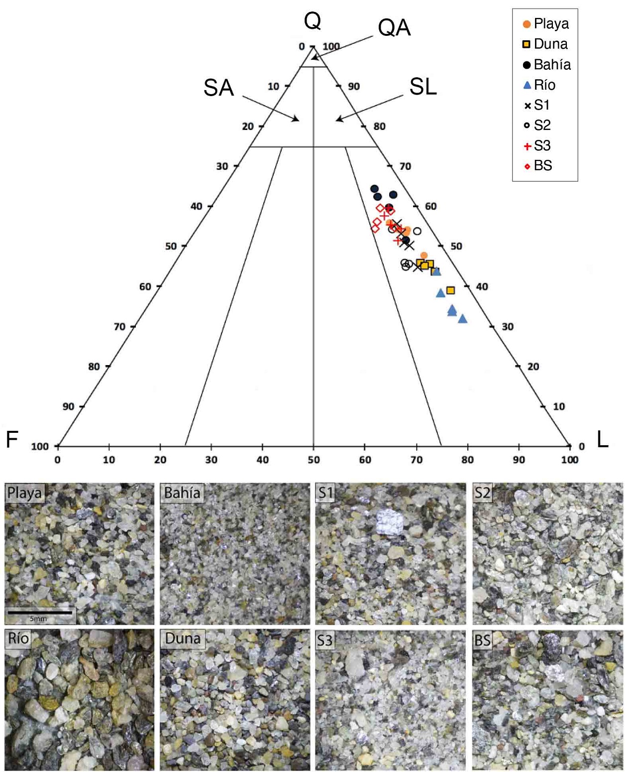 Todas las muestras analizadas quedan incluidas dentro de la clasificación de las litoarenitas (Apéndice A4), donde tanto las muestras de ambientes modernos como las de capas de arena se componen principalmente de cuarzo y fragmentos de roca (predominantemente de esquisto micáceo) con escaso feldespato. A pesar de que la proporción de cuarzo y fragmentos líticos varía ligeramente, no existe gran diferencia composicional entre las muestras.