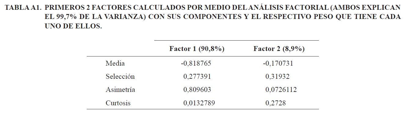 Las relaciones señaladas entre parámetros guardan relación con los coeficientes de correlación (Tabla A2) y la matriz rotada resultante del análisis factorial, sobre todo entre la media y la asimetría, mientras que la curtosis no parece ser relevante para diferenciar los distintos tipos de depósitos de arena considerados en este estudio. La distribución de las muestras en función de los 2 factores principales determinados por el análisis factorial (Fig. 6), y en consideración que el primero de ellos explica casi la totalidad de la varianza (90,8%), podría sugerir que, a grandes rasgos, las capas de arena se asocian preferentemente a los ambientes de playa y dunas que se concentran entorno a valores medios (Fig. 6). Sin embargo, no es posible hacer una distinción clara entre ellas, salvo el caso de S3 que claramente se distribuye cerca de las muestras de bahía. La separación que existe entre las muestras de ambientes modernos y capas de arena de acuerdo con el segundo factor (Factor 2) se explicaría, básicamente, por la menor selección que presentan estas últimas respecto de las primeras (Fig. 6).