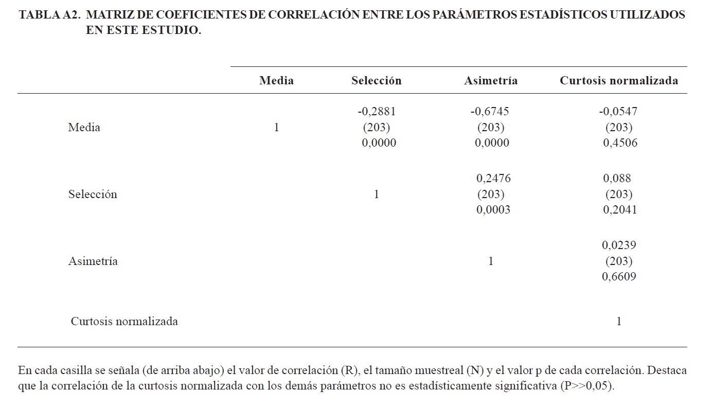 La comparación de los parámetros estadísticos (Apéndice A5) permite establecer que, a pesar de existir valores de bahía y río que se escapan del comportamiento general, el grado de selección tiende a mejorar a medida que disminuye el tamaño medio de grano, de manera similar a lo propuesto por Griffith (1951) con base en el control hidráulico. Un comportamiento equivalente se observa al comparar media con asimetría, lo que resulta lógico al considerar que las muestras de menor tamaño de grano concentran los datos con una asimetría negativa y viceversa, siempre que se considere una población que se distribuya dentro del rango de las arenas (Folk y Ward, 1957). La distribución de muestras obtenida en la comparación entre curtosis y asimetría (Apéndice A5) es esperable debido a que existe una tendencia de las muestras más asimétricas a ser más leptocúrticas, en cambio aquellas más simétricas en general se encuentran mejor distribuidas y el valor de curtosis disminuye (Folk y Ward, 1957; Friedman, 1962).
