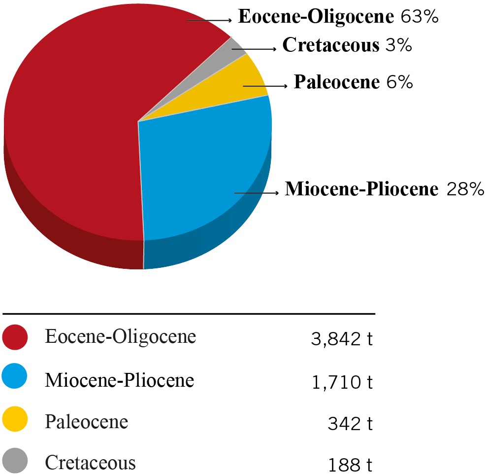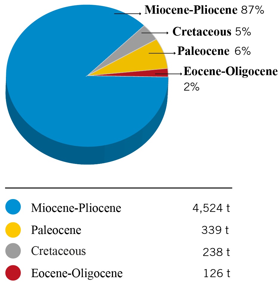 Fig. 2. Gold content (%) in different geological epochs and periods based on 31 main gold deposits (Table 1). Cretaceous 238 t (6 deposits), Paleocene 339 t (4 deposits), Eocene-Oligocene 126 t (2 deposits), Miocene 4,524 t (19 deposits).