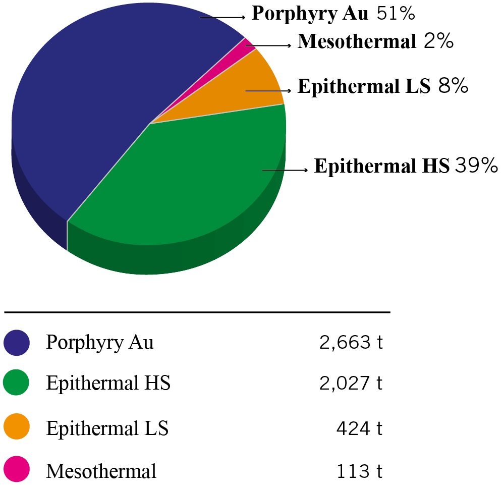 If we consider those (Table 1) defined as gold deposits group (31 cases), mainly epithermal precious metals deposits and porphyry gold, the gold concentrations are (Fig. 2): Mesozoic, 238 t (5%), Paleocene, 339 t (6%), Eocene-Oligocene 126 t (2%) and Miocene, 4,524 t (87%). Within the same group but according to the gold content in the different deposit types, the following distribution is obtained (Fig. 3): mesothermal 113 t (2%), epitermal LS 424 t (8%), epithermal HS 2,027 t (39%) and porphyry Au 2,663 t (51%).