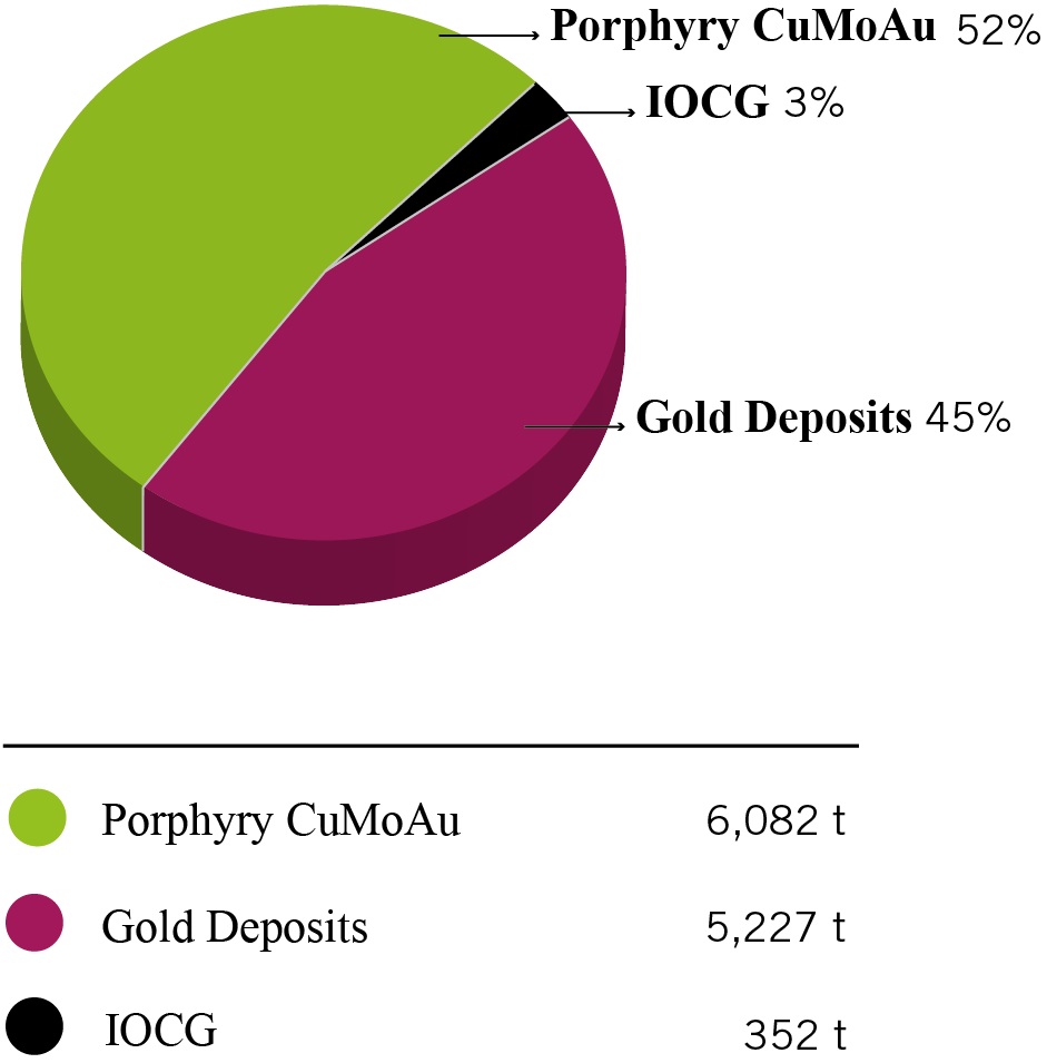 And if we take all 82 deposits types (this means those defined as gold deposits plus porphyry coppers and IOCG) the gold content distribution according the geological age is (Fig. 5): Mesozoic, 778 t (7%), Paleocene, 681t (6%), Eocene-Oligocene, 3,968 t (34%) and Mio-Pliocene, 6,234 t (53%). But based on the deposit type, the following gold distribution is obtained (Fig. 6): gold deposits 5,227 t or 168 Moz (45%), IOCG 352 t or 11 Moz (3%) and porphyry copper 6,082 t or 195 Moz (52%).