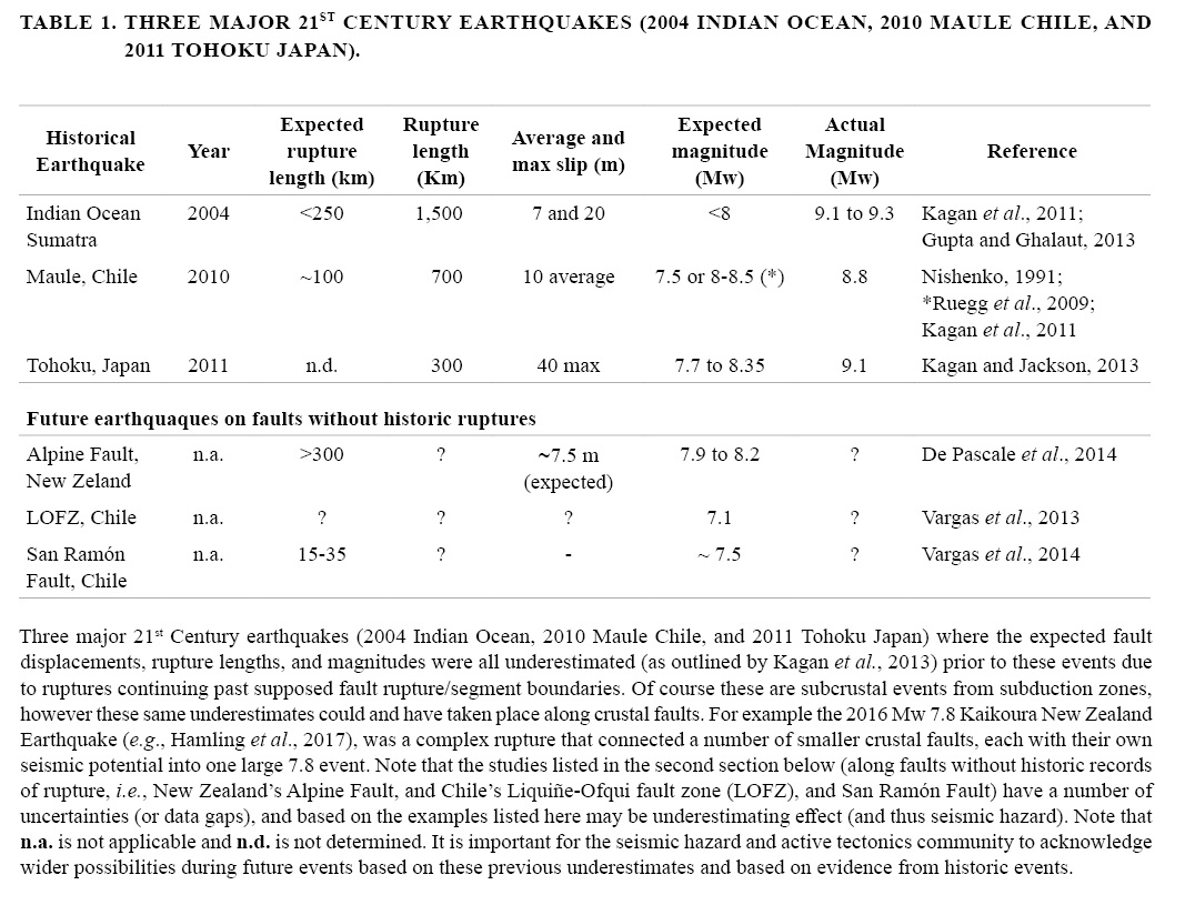 In terms of the magnitude ranges mentioned by Santibáñez et al. (2019), as mentioned above these are perhaps inconsistent with the literature and under-acknowledge magnitude possibilities from global fault systems that we should consider as possibilities for similar fault systems in Chile. Specifically in 1949, a Ms 7.8 and Ms 7.5 crustal earthquakes occurred in Tierra del Fuego which were related to the strike-slip crustal faults associated with the plate boundary Magallanes Fault System (e.g., Forsyth and Uyeda, 1975; Winslow, 1982; Jaschek et al., 1982; Pedrera et al., 2014; Sandoval and De Pascale, 2020; Roy et al., 2020). Additionally, new research by Kanamori and Rivera (2017) along the master fault of the Liquine-Ofqui fault zone (LOFZ), suggest that an Mw 7.7 aftershock of the 1960 Mw 9.5 giant Valdivia earthquake occurred on June 6, 1960 as a dextral strike-slip event along the LOFZ. The 2007 Aysen earthquake sequence led Kanamori and Rivera (2017) and Kanamori et al. (2019) to conclude that a north-south trending right-lateral strike-slip structure, likely the LOFZ is responsible for this June 6 Mw 7.7 event, and that the best match for the observed waveforms from this event is 11 km (i.e., in the crust), although they mentioned that the June 6th event could be considerably deeper than 11 km. Although this could be a slow earthquake, and perhaps from near the base of the brittle-ductile transition zone, it should still be considered within the realm of observations and potentialities along crustal faults in Chile. Importantly, Kanamori and Rivera (2017) state that they are unaware of any crustal fault evidence along the LOFZ, however recent work by Vargas et al., (2013) and work by Villalobos et al. (2020), clearly demonstrate presence of active crustal faults associated with the LOFZ, and coincident with the Kanamori and Rivera (2017) data with associated evidence for prehistoric fault ruptures. Noting the short timing of the global recorded seismic network, the geologic record forms the only prehistoric registry of major earthquakes in Chile. Furthermore, just because Ms 7.8 is the maximum recorded event in Chile for a crustal earthquake, does not mean that even larger events are not possible. Global evidence shows that all three styles of faulting mentioned in Santibáñez et al. (2019) are capable of reaching higher than the values listed in their paper, with normal faults (up to Mw 7.6; Middleton et al., 2015), reverse faults (≥Mw 8), and strike-slip fault (≥Mw 8.0 and up to Mw 8.6; e.g., Satriano et al., 2012; De Pascale and Langridge, 2012). Why would faults found in Chile behave differently, if of course these active structures have sufficient fault area within the seismogenic zone, which admittedly is not always known? Estimations for seismic potential from global evidence shows, normal fault earthquakes, although generally from Mw 7.0 to 7.3 (Schwartz and Coppersmith, 1984), can extend up to Mw 7.6 (Middleton et al., 2015), reverse faults earthquakes can be up to Mw 8.3 (e.g., Lettis et al., 1997), and strike-slip fault earthquakes ≥Mw 8.0 and up to Mw 8.6 (e.g., Satriano et al., 2012; De Pascale and Langridge, 2012). Thus the potential estimates (“Volcanic domain” Mw 6.2 to 6.7; “Outer Forearc” Mw 7.0 to 7.5 and “Inner Forearc” Mw 7.2) as suggested by Santibáñez et al. (2019) seem perhaps a bit low and perhaps a mention here about the possibilities for these faults, based on global data, will be better aligned with global practices. Under estimations of events magnitude and impacts and possibilities do occur (Table 1). The recent 2016 Mw 7.8 Kaikoura New Zealand Earthquake was an event that involved a number of smaller crustal faults that connected ruptures and linked up to make a larger event (e.g., Hamling et al., 2017). In this instance there is also some evidence that these faults may have also connected with the subduction interface (Hamling et al., 2017), which further complicates the simple binary crustal and subcrustal discussion above. If and when there is interplay between crustal faults and subcrustal faults, this discussion and the potential magnitudes associated with these complex ruptures of course becomes much larger. To conclude this section, it is my opinion that the magnitude ranges for crustal earthquakes suggested by Santibáñez et al. (2019) are on the low side and the ranges listed above are more consistent with global understanding of possibilities within crustal fault systems. At minimum in the “Volcanic domain” should have events up to at least Mw 7.7 as likely possible for intra-arc faults like the master fault in the LOFZ.