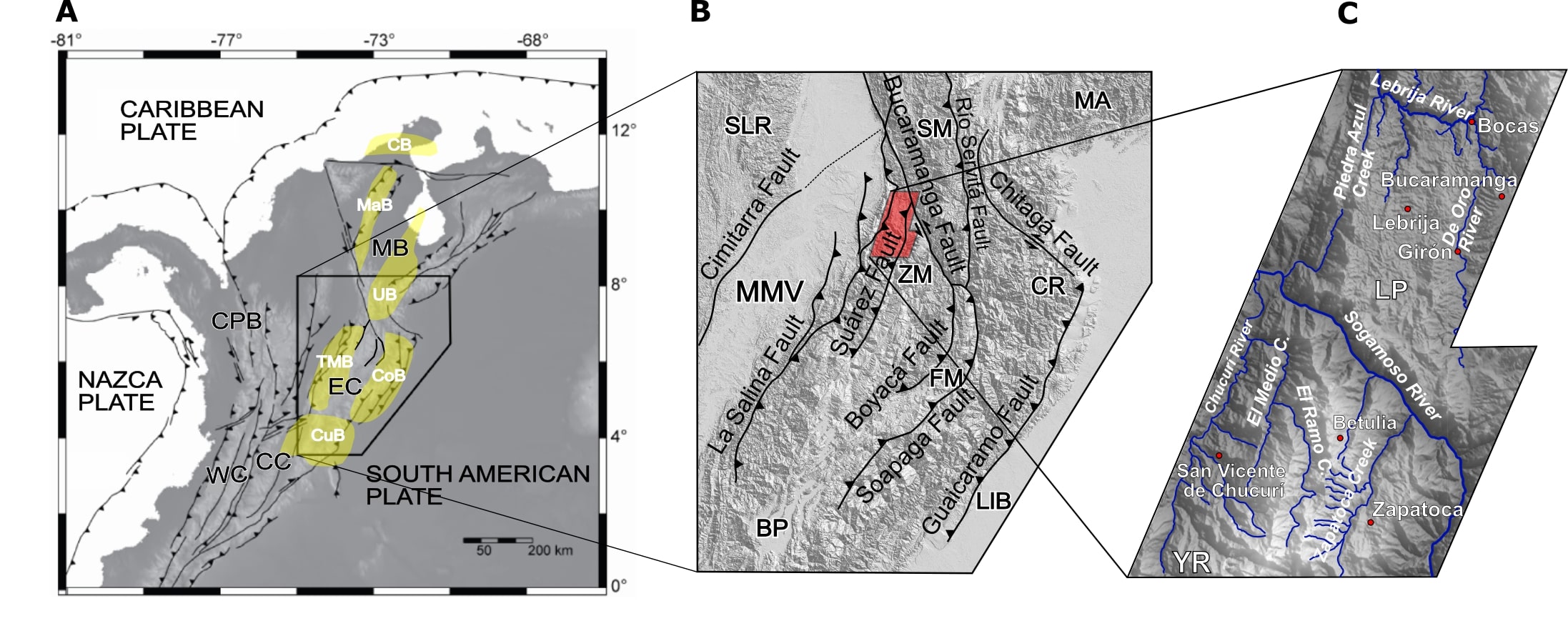 García-Delgado, H.; Villamizar, N.; Bernet, M. 2019. Recent tectonic activity along the Bucaramanga fault system (Chicamocha river canyon, Estern Cordillera of Colombia): a geomorphological approach. Annals of Geomorphology 62: 199-215. doi: 10.1127/zfg/2019/0630.