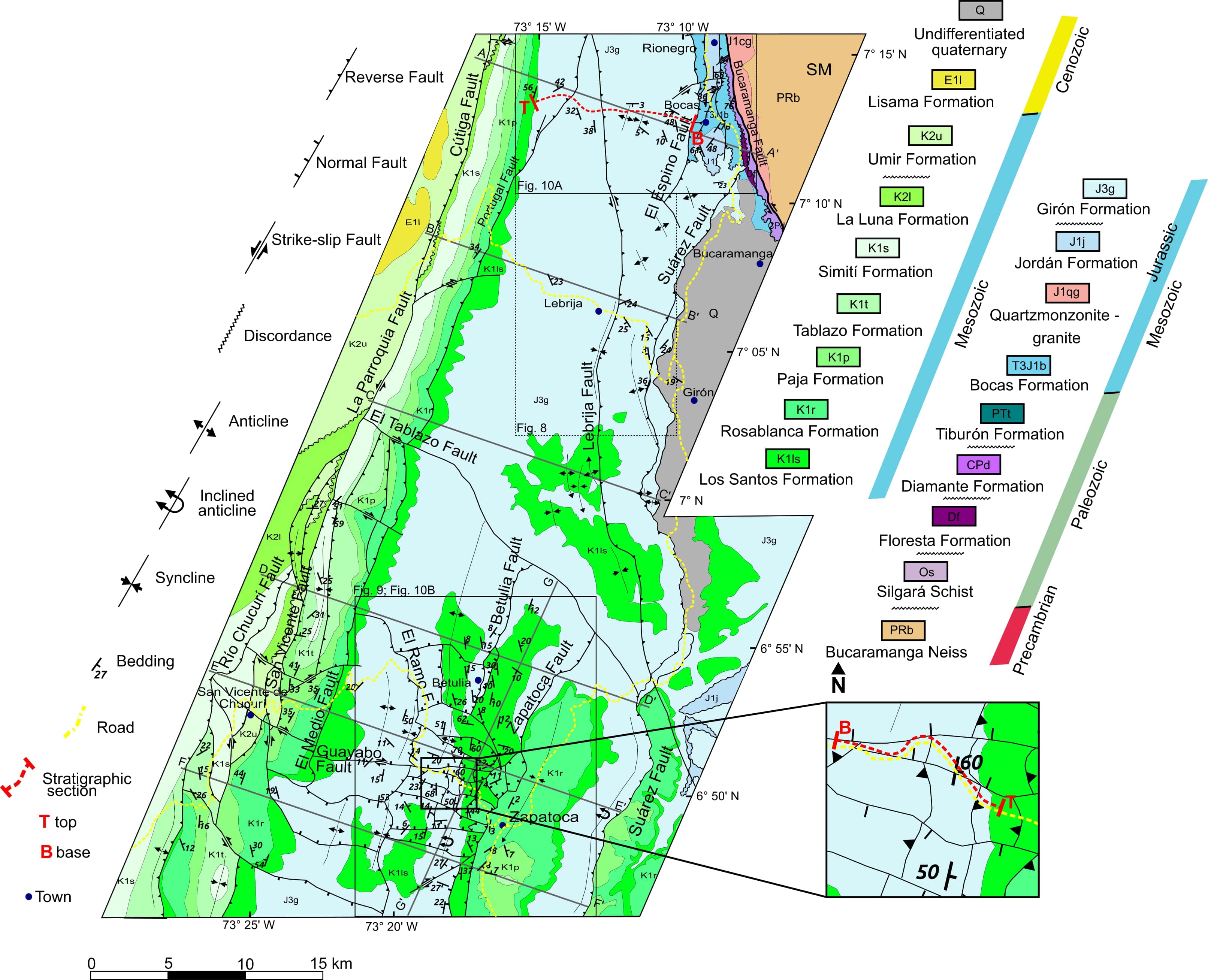 Several transverse faults border the termination of longitudinal faults and folds, as the El Tablazo Fault, which marks the abrupt northern end of the San Vicente, Betulia and Zapatoca faults (Figs. 2 and 3 section G-G’ and 4E and F). El Tablazo Fault is responsible for the actual orientation of the Sogamoso River which cuts the Yariguíes Range in a NW-SE direction (Fig. 1). Other minor transverse faults (e.g., La Zarza Fault, Quebraditas Fault, Fig. 2) separate beds with different attitude or juxtapose different geological units along the trend of the major folds, and in some cases, these transverse faults seem to control the change in sedimentological attributes of the Girón Formation, as described below.