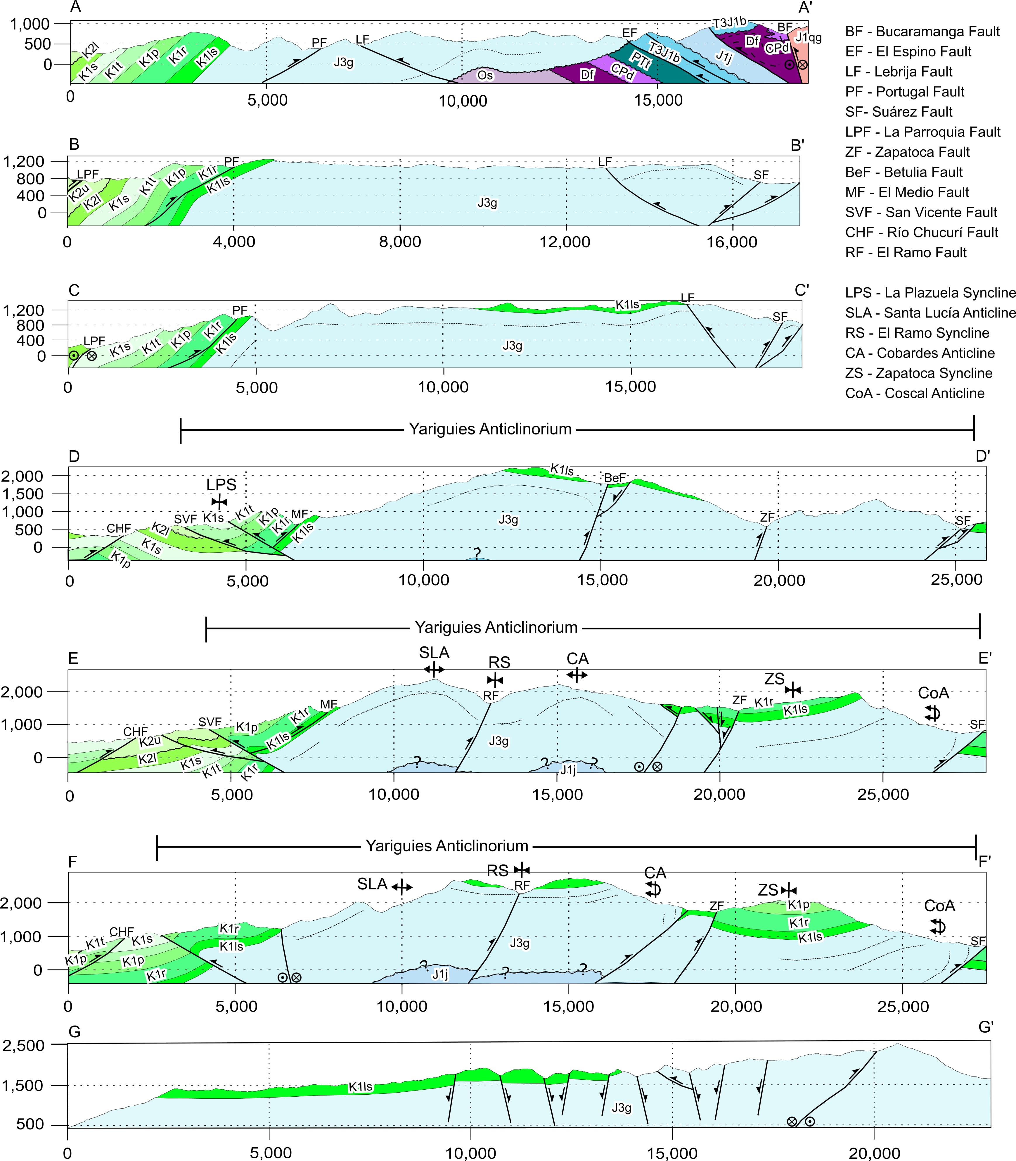 Fig. 3. A-A’ to G-G’ cross sections of the study area as indicated in figure 2. A thickness of 2,500 m is assumed for Girón Formation in sections D-D’, E-E’, F-F’. Legend as in the geologic map in figure 2. This figure illustrates the along strike variations in the structuration of the Yariguíes Anticlinorium.).