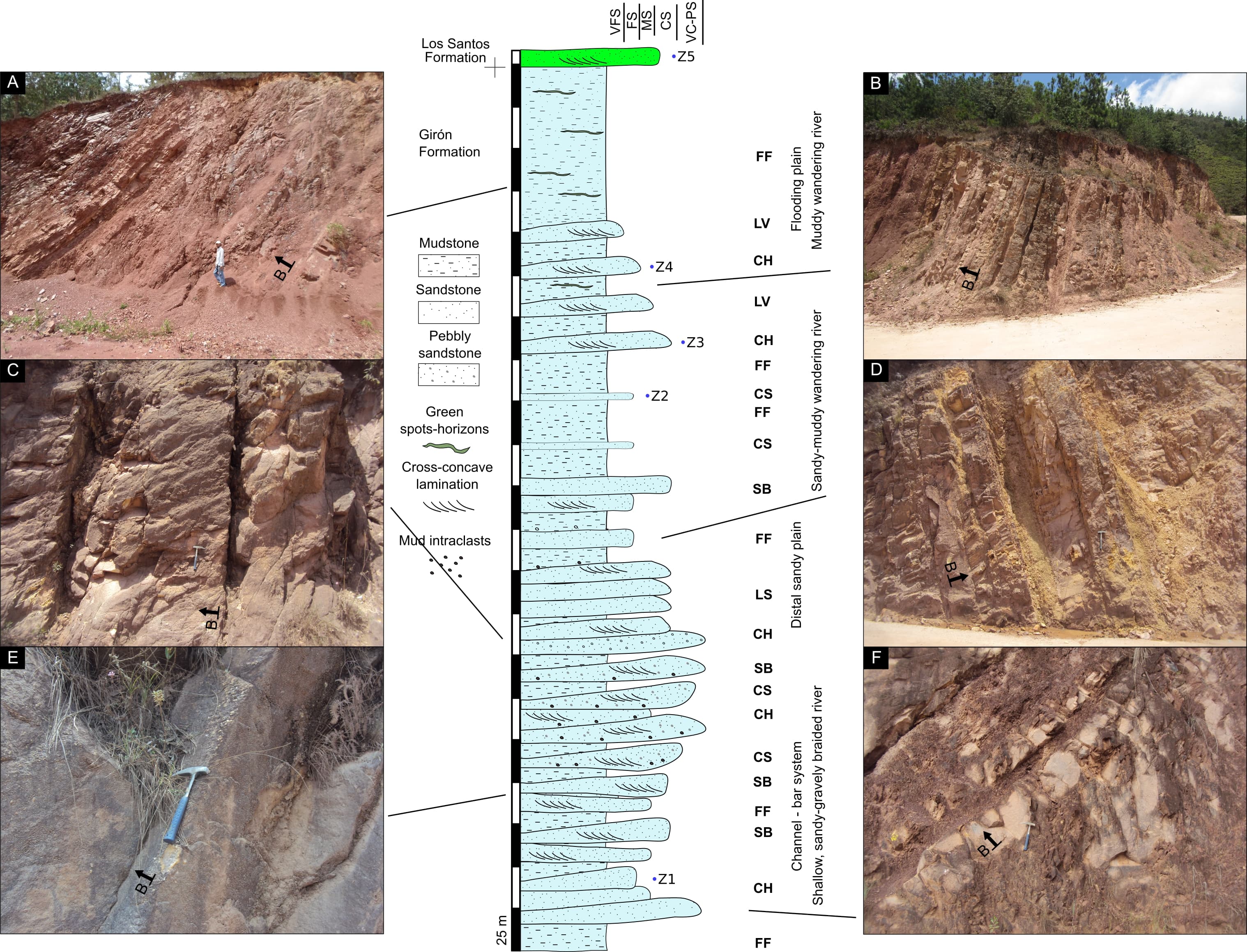 The Girón Formation in the Lebrija River type section shows cyclicity in the facies evolution. The first six segments (A-F) show various cycles of deposition in a braided river system (segments A and C) and its floodplain (segments B, D and F); generating different depositional forms as sandy-gravelly bars, channel fill profiles, and levees and crevasse splays in the floodplain. Segment E represents a less energetic environment in which soils developed, probably a swamp as revealed by the presence of fossil roots (Cediel, 1968).