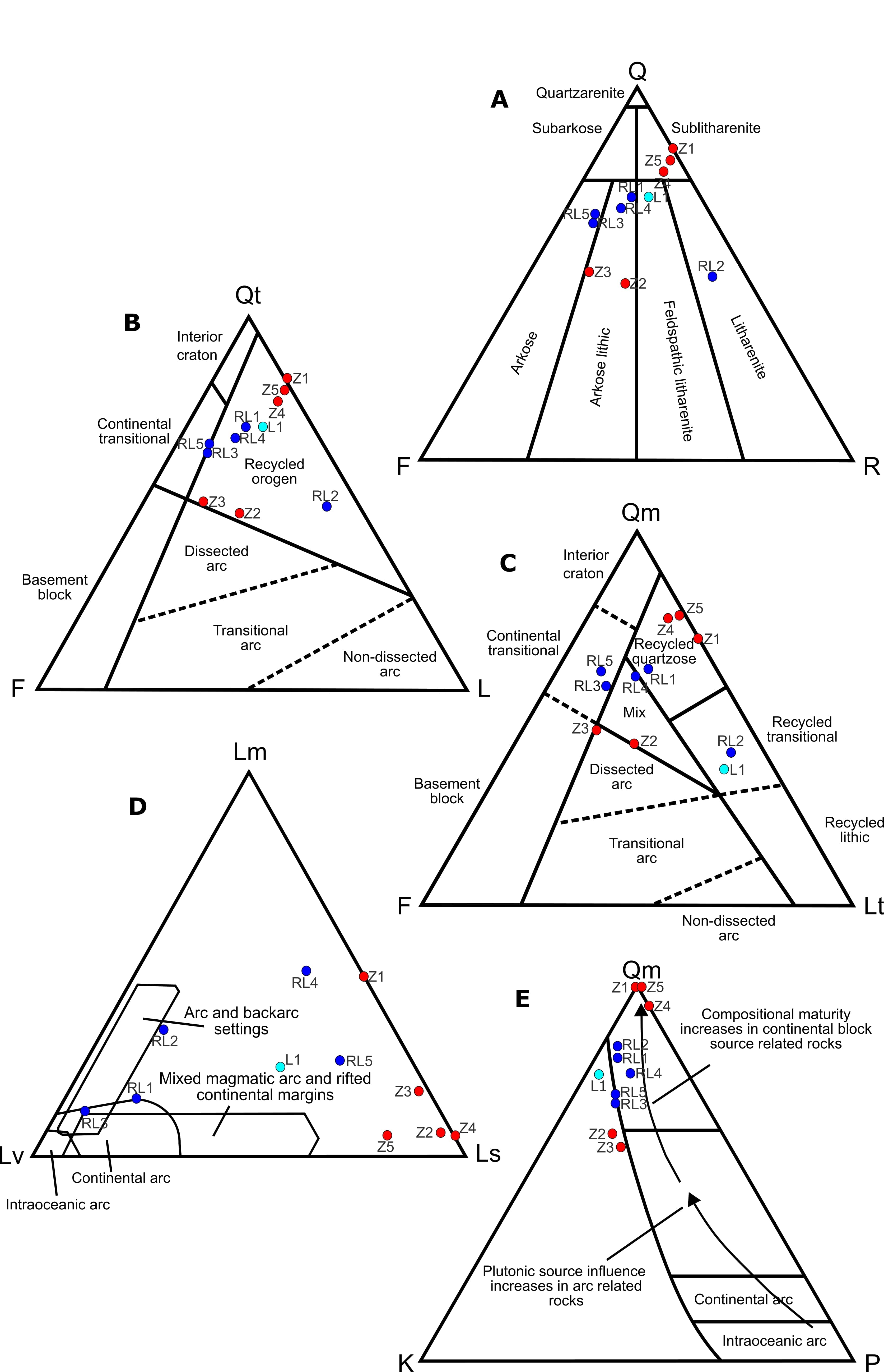 Fig. 7. Classification and provenance diagrams for sedimentary rocks used in this work. Modified from A. Folk, 1968; B., C., E. Dickinson, 1985; D. Marsaglia and Ingersoll, 1992.