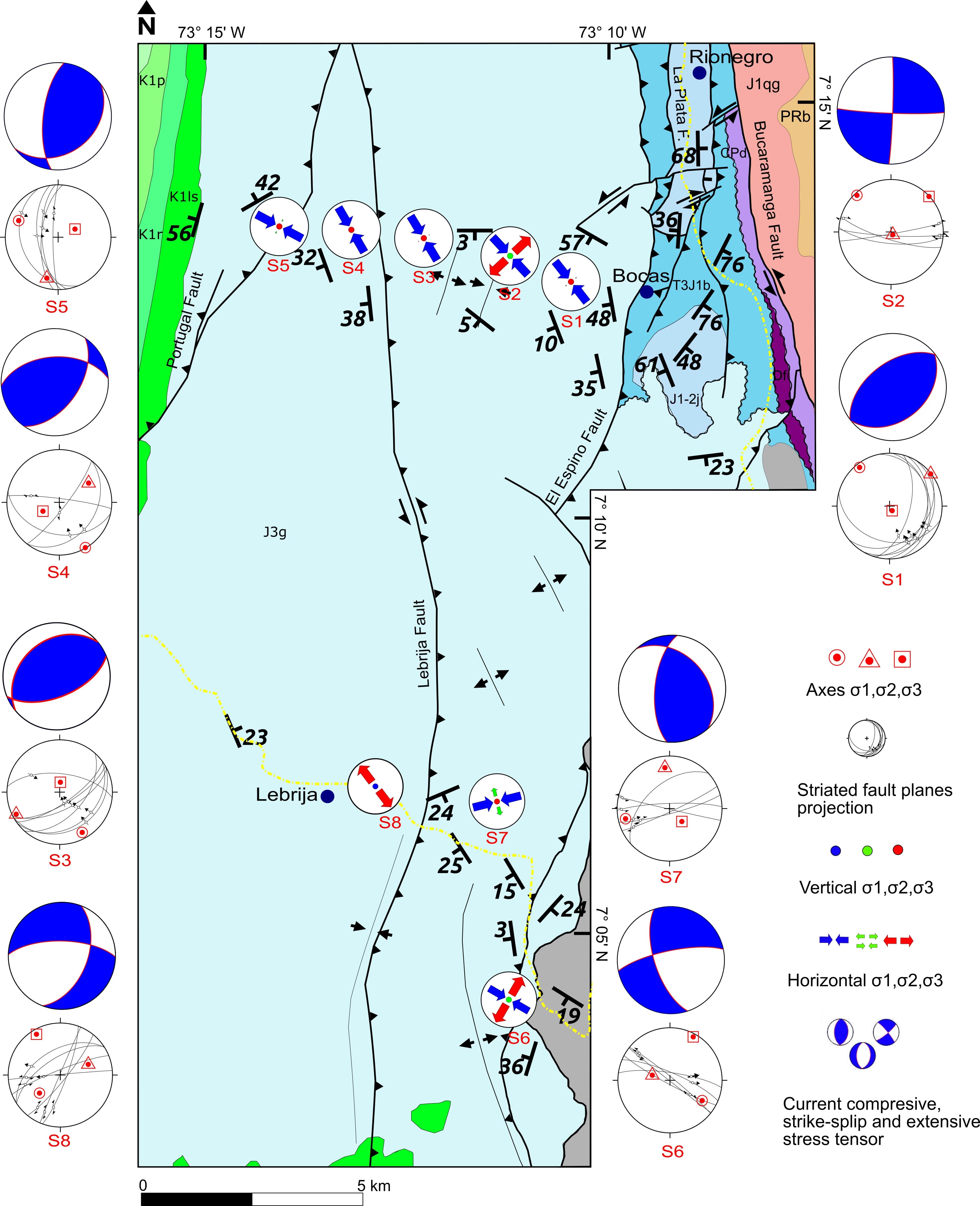 The obtained stress tensors for the Lebrija River (Fig. 8) show a dominant compressional stress regime, as evidenced by the reverse faults and local folds. Transverse faults with a NW strike and reverse kinematics are especially related to the stress tensor (sites 1, 3-5, and 7 in Fig. 8), as well as other W-E trending faults with dextral movement as shear planes of the same stress orientation (site 2 in Fig. 8). The systematic NW-SE orientation of the horizontal compressive axes (or horizontal maximum stress: Shmax) seems to be related to the current stress tensor imposed by the sinistral kinematics of the Bucaramanga Fault.