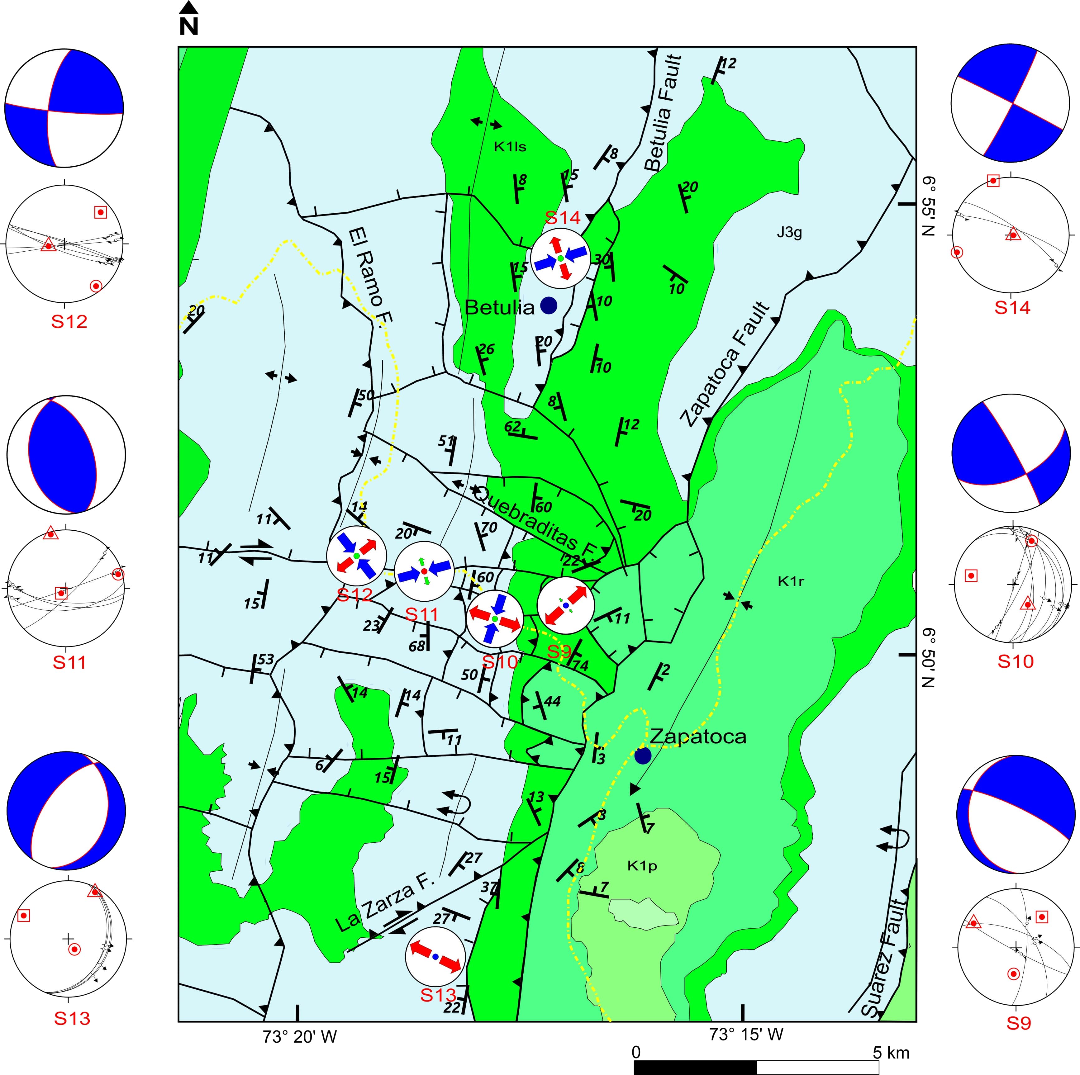 The Shmax oriented NE-SW, can be related to the onset of compressional deformation in the Eastern Cordillera driven by the accretion of the Western Cordillera to the western continental border 75-70 Ma ago (Bayona et al., 2013; Villagómez and Spikings, 2013; Mora et al., 2015). Although it is considered the oldest stress tensor among the obtained ones in the area (Cortés et al., 2005; Cetina et al., 2019), some works propose the existence of previous deformational phases in the Eastern Cordillera during the Early and Late Cretaceous, and relate these compressive events to an east directed flat slab subduction (e.g., Guerrero, 2019). The few tensors in the zone show this event in local extensional (S8 in Fig. 8 and S13 in Fig. 9) and transtensional (S10 in Fig. 9)regimes. The orientation of these stress tensors, as well as the transverse faults in the area, can be related to the reactivation of the transverse barriers of the former Jurassic-Cretaceous basin; since the associated transverse structures settle control as zones of anisotropy. Jiménez et al. (2016) explain lateral variation is the structural styles for a sector of the Middle Magdalena Valley Basin in this same sense.