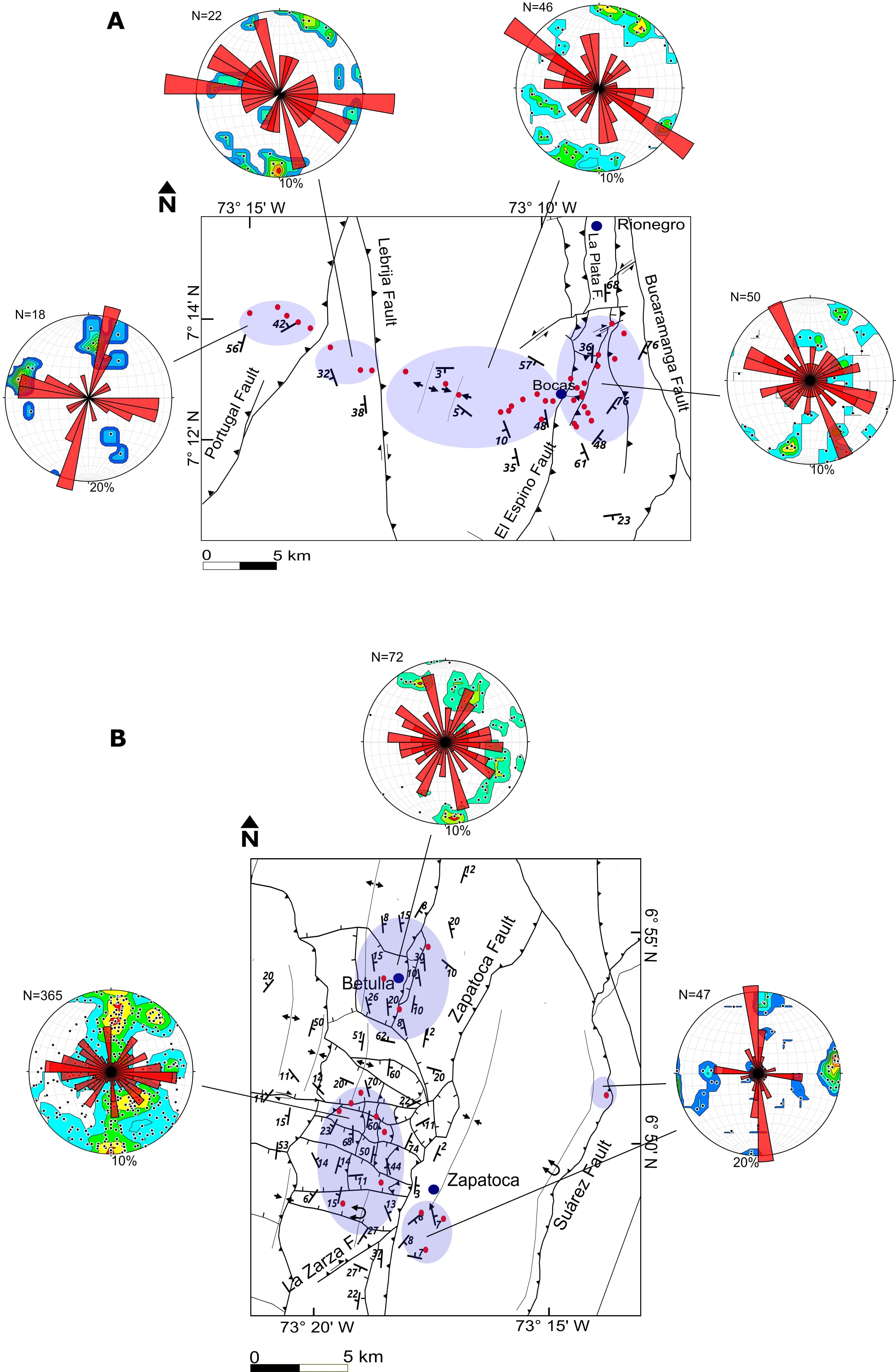 For the Zapatoca area, we have clustered the data into three areas: (i) between the Zapatoca and Suárez faults, (ii) Betulia and (iii) NW Zapatoca, between the El Ramo and Zapatoca faults (Fig. 10B). The first group shows the N trending longitudinal joints, but with high angles, which are consistent with tensile fractures parallel to the axial plane of the Coscal Anticline, interpreted as a drag fold of the Suárez Fault. This assumption rises since most of the measured joints of the group correspond to the closest site to the fault, whereas the data of the second set (Betulia) show a random distribution, but for the same reason can be representative of the whole fracture frame of the area. In contrast, the third group which includes the highest data population exhibits in a clear way the W-E trend that matches well with the abundant normal faults of the sector, disposed transverse to the reverse longitudinal faults.