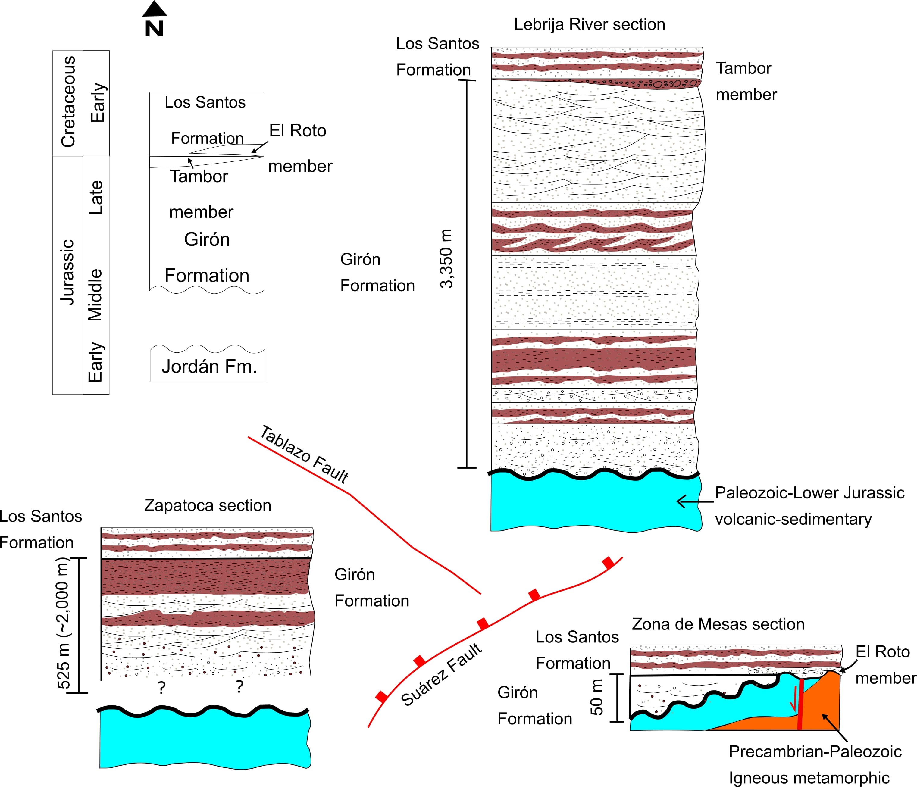 The Girón Formation encompass all the fluvial-alluvial units deposited during the Late Jurassic in basins shaped as half-grabens, segmented and separated by accommodation zones, relay ramps and/or transfer faults, whose presence was the cause of the lateral variations in thickness, provenance and sedimentary facies between the synchronic units deposited in these basins.