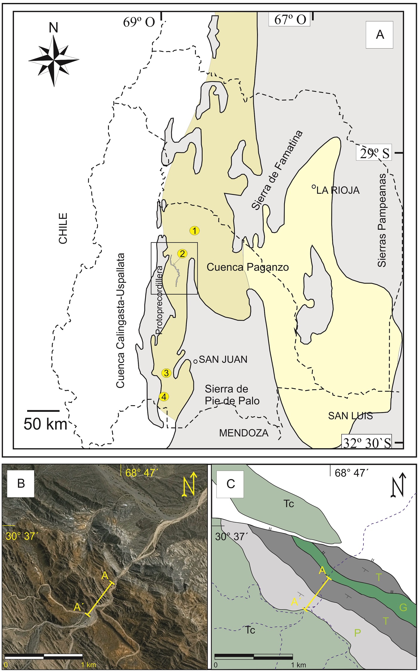 FIG. 1. A. Esquema paleogeográfico de la Cuenca Paganzo, modificado de Salfity y Gorustovich (1983). 1: localidad Huaco; 2: marca la ubicación de la localidad Río Francia; 3: localidad Maradona y 4: localidad Bachongo. Los depocentros explicados en el texto se muestran en amarillo claro (depocentro oriental), amarillo oscuro (depocentro central) y blanco (depocentro occidental o Cuenca Calingasta-Uspallata). B. Detalle de la localidad Río Francia, se destaca la sección A-A´ donde se relevó la columna de la figura 2. C. Interpretación de las unidades analizadas. G: Formación Guandacol; T: Formación Tupe; P: Formación Patquía; Tc: Terciario indiferenciado.