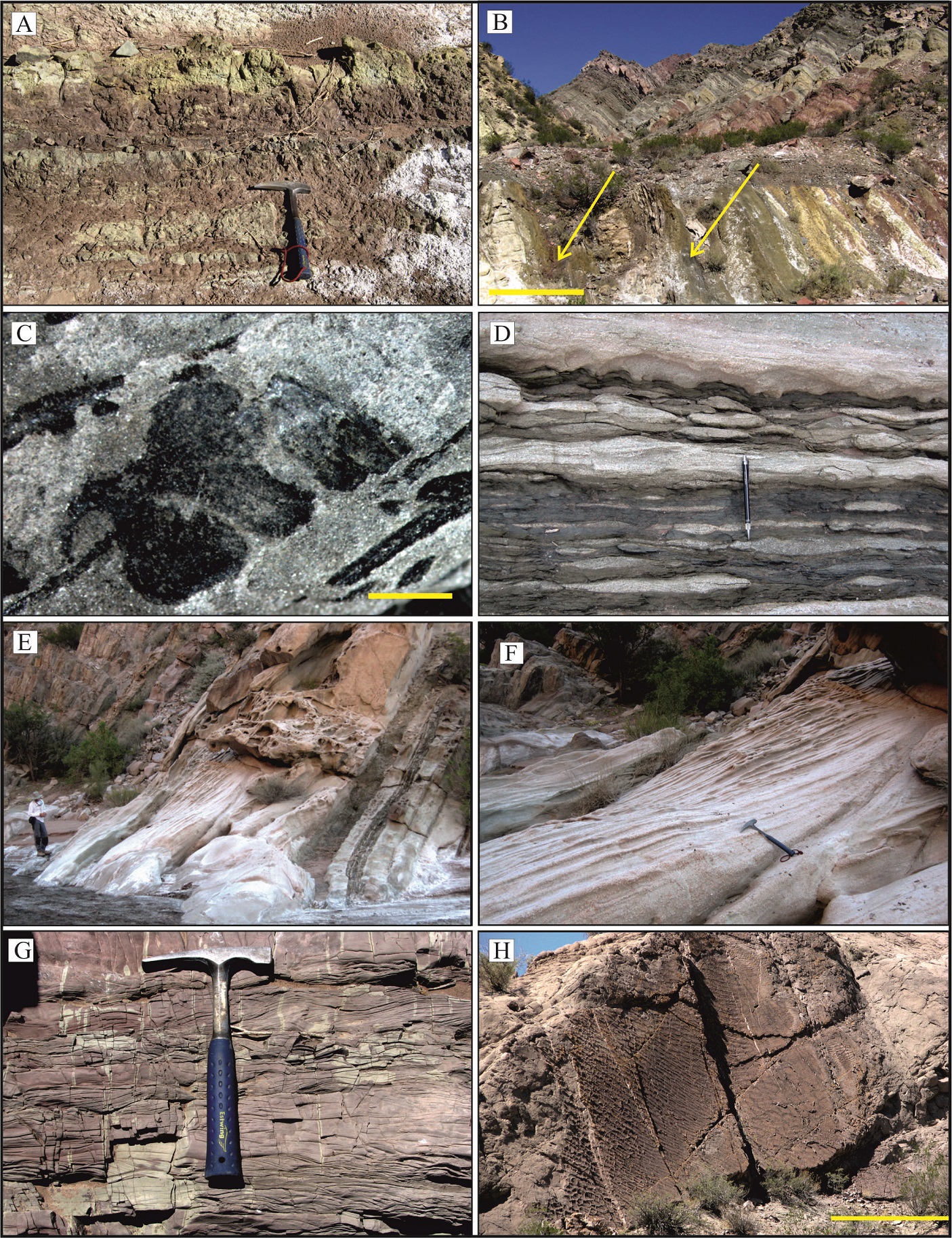 FIG. 3. Detalle de las unidades litológicas y estructuras sedimentarias que constituyen las distintas asociaciones de facies de la Formación Tupe. A-B. Vistas de las pelitas bioturbadas (asociación de facies I), interpretadas como depósitos de lagoons (Miembro areniscas varicolores, sensu Cuerda y Furque, 1981), donde preservan restos megaflorísticos, indicados con flechas. Barra de escala en B=1 m. C. Euphenopteris sp. (escala: 1 cm). D. Ondulitas simétricas a levemente asimétricas, tipo flaser, presentes en las rocas pelíticas. E-F. Vistas de los sets de areniscas medias a gruesas de forma tabular, típicas de la asociación de facies II. F. Véase la potencia, los contactos entre sets y el entrecruzamiento tabular planar a gran escala (2 m). G. Detalle de ondulitas simétricas en areniscas, con bioturbación vertical. H. Trenes de ondulitas en areniscas, vista en planta, la barra de color amarillo es aproximadamente 1 m de largo.
