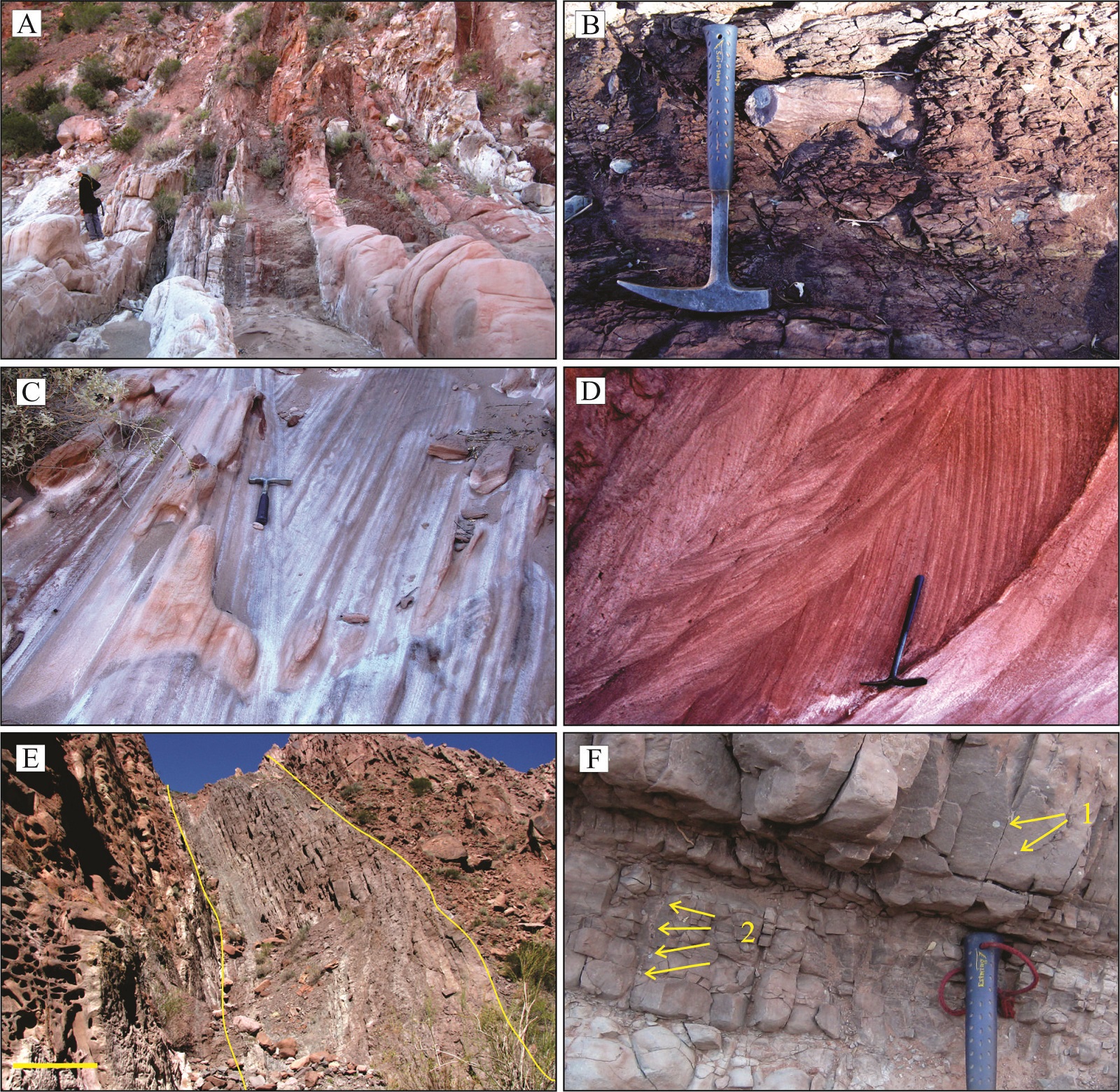 Descripción: esta facies es la de mayor potencia de la unidad, con un espesor total de 177 m de areniscas rojas, en 5 recurrencias. Se caracteriza por la presencia de areniscas finas a muy finas con muy buena selección, alta porosidad y sin matriz. Los sets tienen formas acuñadas de hasta 1 m de espesor o bien tabulares de espesores de hasta 0,40 m (Fig. 4C). Las estructuras sedimentarias más comunes son estratificación entrecruzada en artesa, laminación ondulítica, tabular planar, planar tangencial y horizontal (Fig. 4D). Además, poseen altos porcentajes de granos de cuarzo y de forma complementaria de feldespato potásico. Como rasgo de campo complementario es notable la cantidad de concreciones circulares-subesféricas de hasta 0,30 m de diámetro y geoformas de nidos de avispas.