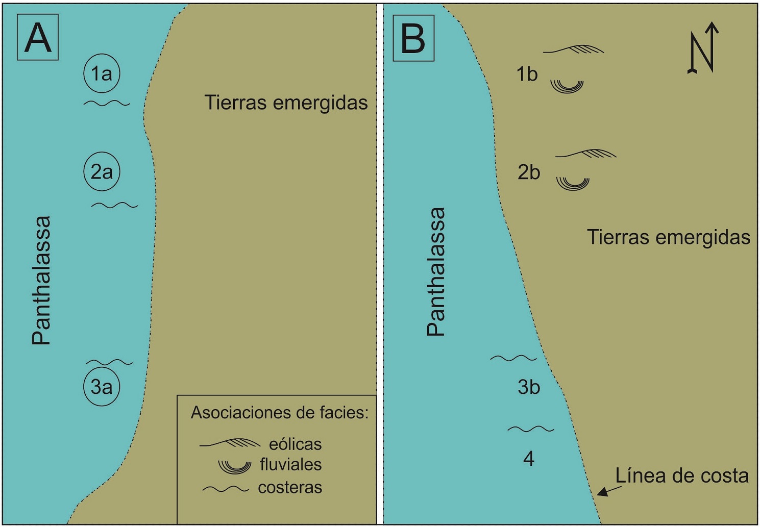 De esta forma, la localidad Río Francia se vincula como un punto estratégico de correlación en la Cuenca Paganzo. Al norte, en la localidad de Huaco, la Formación Tupe presenta paleoambientes sedimentarios costeros y asociados a la costa (Desjardins et al., 2009), los cuales serían temporalmente correlacionables con la sucesión descrita en la localidad Río Francia (asociaciones de facies I, II y III). En cambio, al sur en la Formación La Deheza, en sus sectores medios, se destacan paleoambientes sedimentarios de ingresión marina y fluviales meandrosos con preservación de carbones, los cuales serían correlacionables con la Formación Tupe en Río Francia (Fig. 5A).