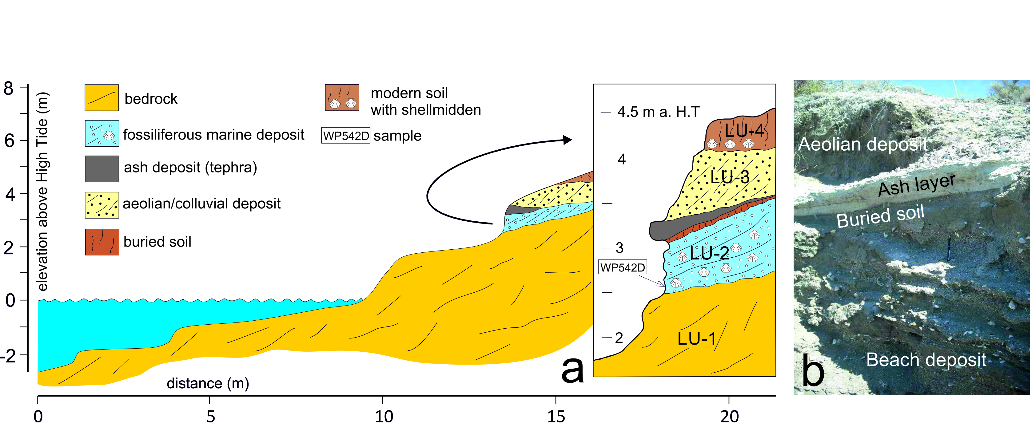 The stratigraphic succession comprises three main lithostratigraphic units (LU, Fig. 2A). The lowest unit (LU-1) correspond to Miocene marine deposits (Formación Patagonia) representing the local substrate. This unit is separated by a planar erosive surface (marine ravinement surface) from LU-2, which is formed by beach deposits. The LU-2 shows 30-50 cm of a basal shelly layer then becomes sandier showing clear low angle stratification and frequent mollusk fragment (Fig. 2B) typical of beach deposits. Shells are mostly fragmented and only a few specimens preserved joined valves. One of this shells yielded a radiocarbon age of 3,967-4,216 a cal BP (Table 3).