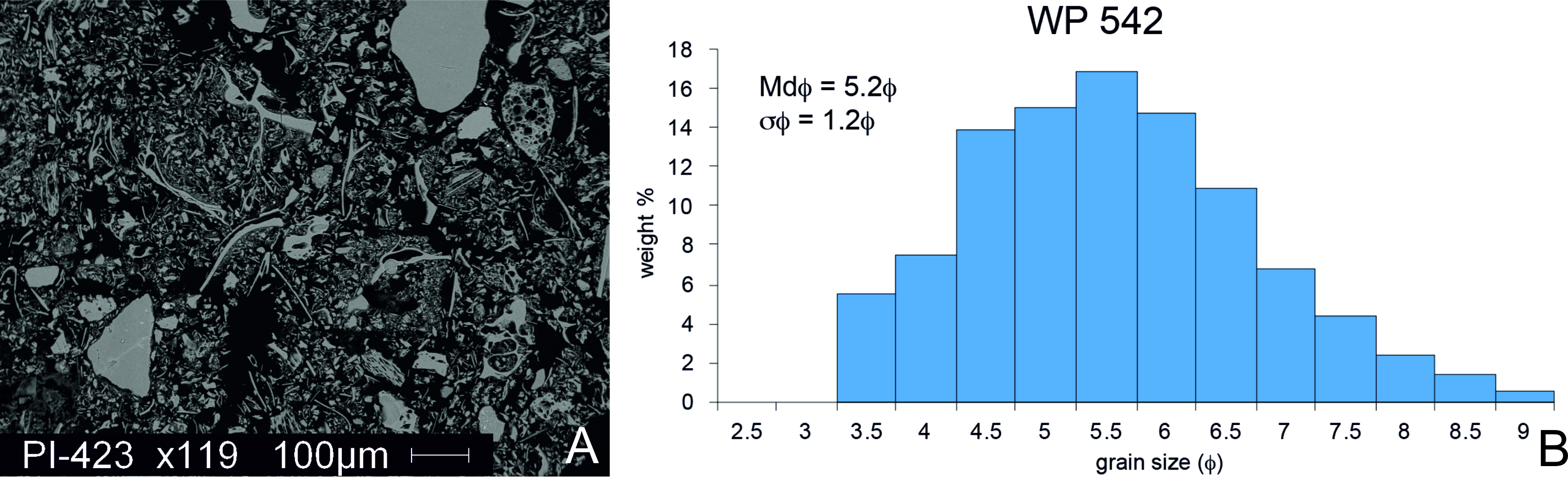 Fig. 3. A. SEM images of the polish section of tephra layer. Note different type of shards and micropumices; B. Grain-size distribution of the basal part of the ash layer (Sample WP542). |