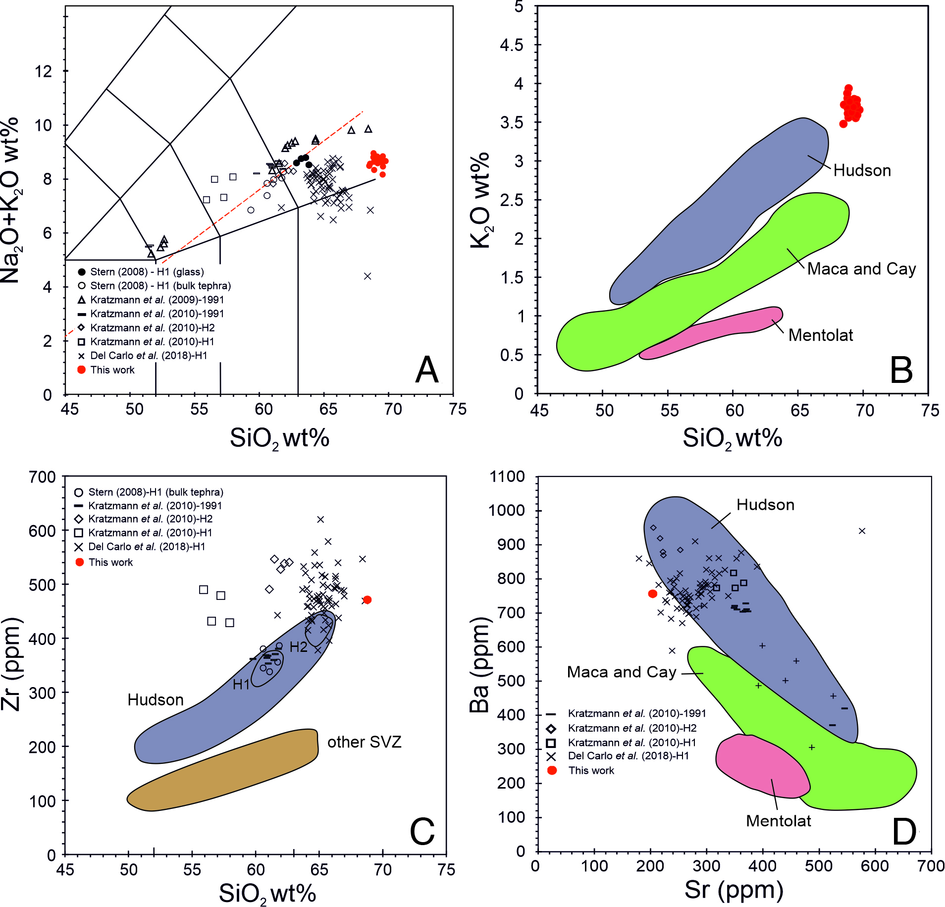 Fig. 4. A. K2O+Na2O-SiO2 diagram (Le Bas et al., 1986) for tephra samples from H1, H2 and H3 (1991) Hudson eruptions (segmented line: separation between Subalkaline and Alkaline rocks according to Irvine and Baragar, 1971); B. K2O versus SiO2 (compositional field after Stern et al., 2016); C. Zr versus SiO2 (compositional field after Naranjo and Stern, 1998); D. Ba versus Sr (different compositional field from Weller et al., 2015). For A, B, C and D: red circle: studied tephra. |
