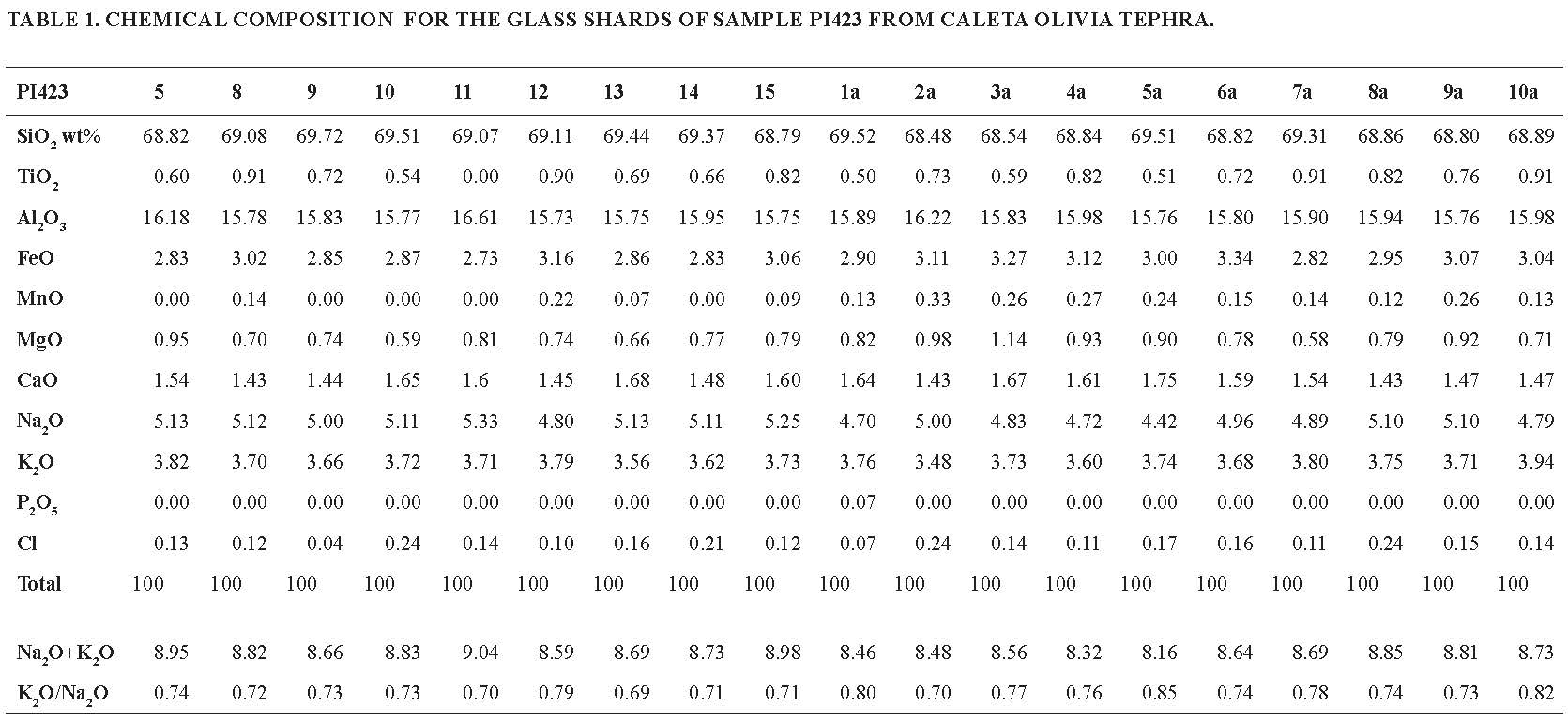 To avoid alkali loss by diffusion a window spot ca. 10 μm wide was used. In some cases, due to the different shapes and sizes of the glass shards a smaller beam size was used. The reduction of the size defocuses the beam and this may affect the analytical data due to the complex combination of element mobility and sample damage (Hunt and Hill, 2001). However, this potential bias is minimized by analyzing several shards from the same sample (Zanchetta et al., 2012b). (Table 1) shows the data.