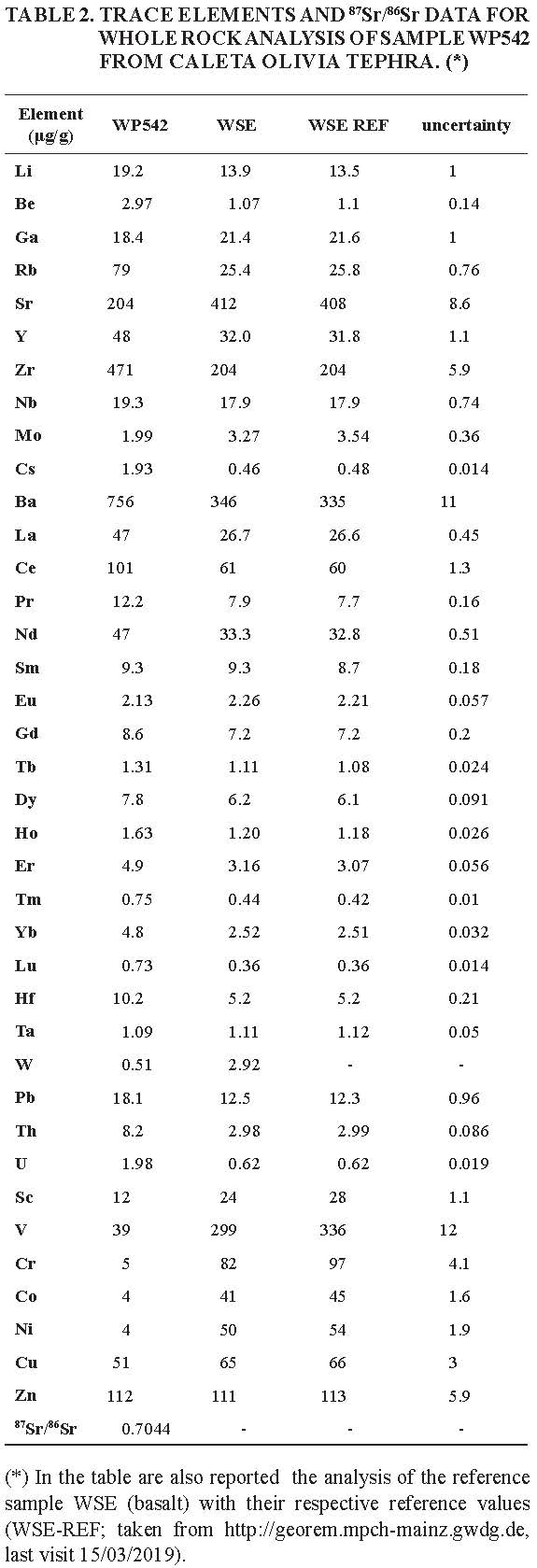 Sr isotope composition was determined by thermal ionization mass spectrometry at the Istituto Nazionale di Geofisica e Vulcanologia, Osservatorio Vesuviano (INGV, Naples, Italy), using a ThermoFinnigan Triton TI multicollector mass spectrometer on a glass shard-rich sample. 0.2 g of sample were leached several times with cold 6 N HCl for 10 min, and then rinsed in pure Milli Q® H2O. After dissolution, Sr was separated by conventional ion-exchange chromatographic techniques. The Sr blank was on the order of 0.1 ng during the period of chemistry processing. Measured 87Sr/86Sr isotope ratio was normalized for within-run isotopic fractionation to 86Sr/88Sr=0.1194. The mean measured values of 87Sr/86Sr for NIST-SRM 987 was 0.710220±0.000019 (2σ). The external reproducibility (2σ) is calculated according to Goldstein et al. (2003). Sr isotope ratio was normalized to the recommended values of NIST SRM 987 (87Sr/86Sr=0.71025) standard. 87Sr/86Sr ratio is reported at the bottom of table 2.