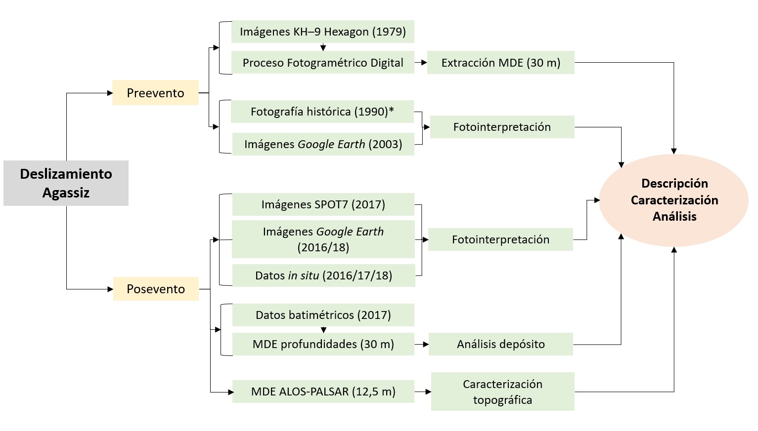 Fig. 2. Diagrama de flujo de los datos y métodos aplicados en el estudio preevento y posevento. *Fotografía tomada de Aniya y Skvarca (1992). MDE (Modelo Digital de Elevación).
