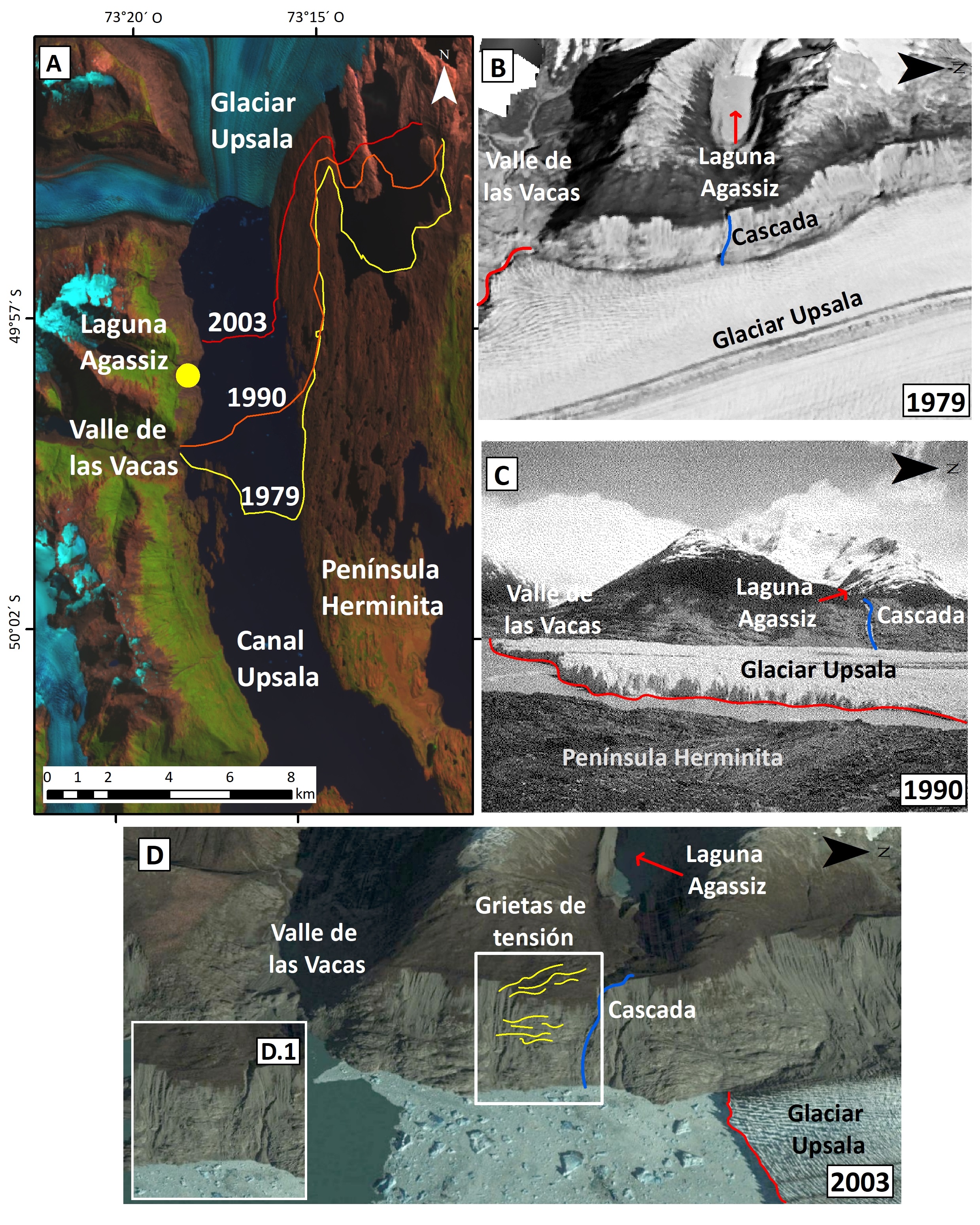 Fig. 3. A. Fluctuaciones del frente del glaciar Upsala en los años 1979, 1990 y 2003, medidas a partir de imágenes satelitales Landsat para los correspondientes años, ubicación del deslizamiento Agassiz (punto sólido color amarillo), sobre imagen Landsat 8 composición falso color 752 (RGB). B. Ladera occidental del canal Upsala sobre una imagen Corona/Hexagon del 20 de marzo de 1979. C. Fotografía de la ladera occidental del canal Upsala del 17 de noviembre de 1990, con la cascada de agua claramente identificada (línea color azul) en el área donde se generó el deslizamiento Agassiz y el frente del glaciar Upsala (línea color rojo). Fotografía obtenida desde península Herminita, margen este del canal, modificada de Aniya y Skvarca (1992). D. Imagen de Google Earth de mayo de 2003, en la cual se evidencia las grietas extensionales (líneas color amarillo) en la zona en la que se inicia el desliza-miento. D.1. Detalle de las grietas sobre la vegetación y material morrénico.