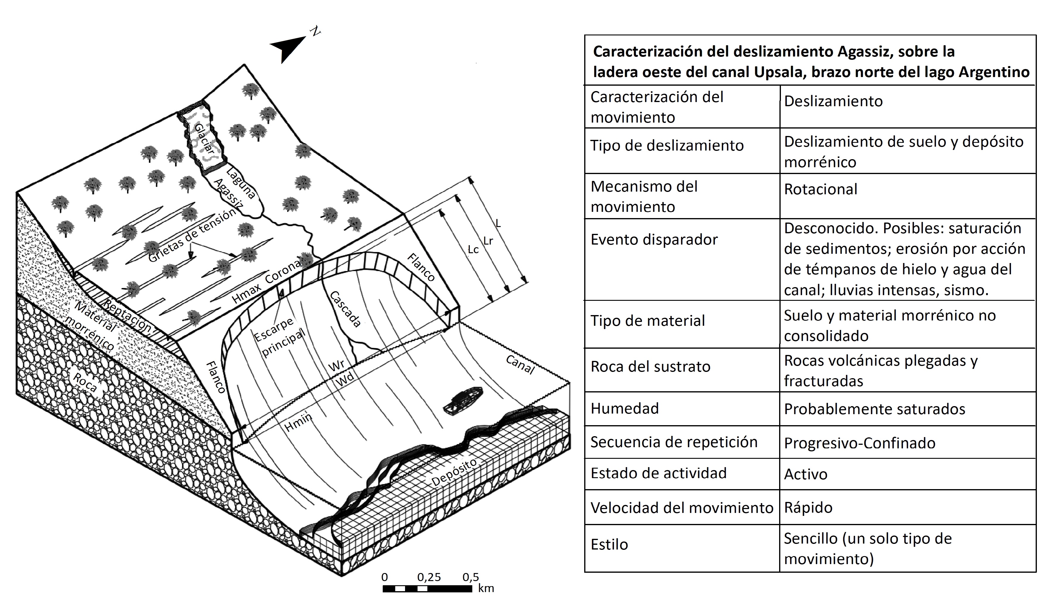El canal Upsala en el brazo norte del lago Argentino presenta una combinación de procesos glaciales y paraglaciales con un gran dinamismo geomorfológico. El deslizamiento Agassiz generado el 10 de febrero de 2013 es un claro ejemplo de los procesos de inestabilidad de las laderas del canal Upsala que denota evidencias de actividad desde hace al menos 20 años. La combinación de factores que alimentaron el proceso de activación y generación del evento incluye, entre los principales factores condicionantes, la presencia de material morrénico no consolidado, depositado en el proceso de retiro del glaciar homónimo; pendientes empinadas y orientadas hacia el noreste, expuestas a mayor cantidad de horas al sol; un sustrato rocoso plegado y fracturado, altamente propenso a la meteorización y la erosión, y la presencia de reptación de suelo, indicado por árboles inclinados y grietas de tensión. En cuanto a los factores desencadenantes, puede constituir uno el proceso de saturación de los sedimentos glaciogénicos de la ladera por el aporte de agua superficial, proveniente de la laguna proglacial situada en la zona superior de la ladera, de precipitaciones y fusión nívea; al igual que la influencia del proceso de erosión del material de las laderas provocado por el desprendimiento de témpanos del glaciar; y la actividad sísmica local y regional. Cabe destacar que se desconoce el factor desencadenante puntual del deslizamiento Agassiz. Como resultado del proceso se produjo un deslizamiento rotacional, sobre una superficie de ruptura cóncava y de desplazamiento rápido. El material deslizado descendió directamente a las aguas del canal Upsala, desplazó un importante volumen de agua que generó un tsunami, impactando en algunos sitios e infraestructuras presentes en el área, hasta una distancia de 20 km hacia el sur del canal.