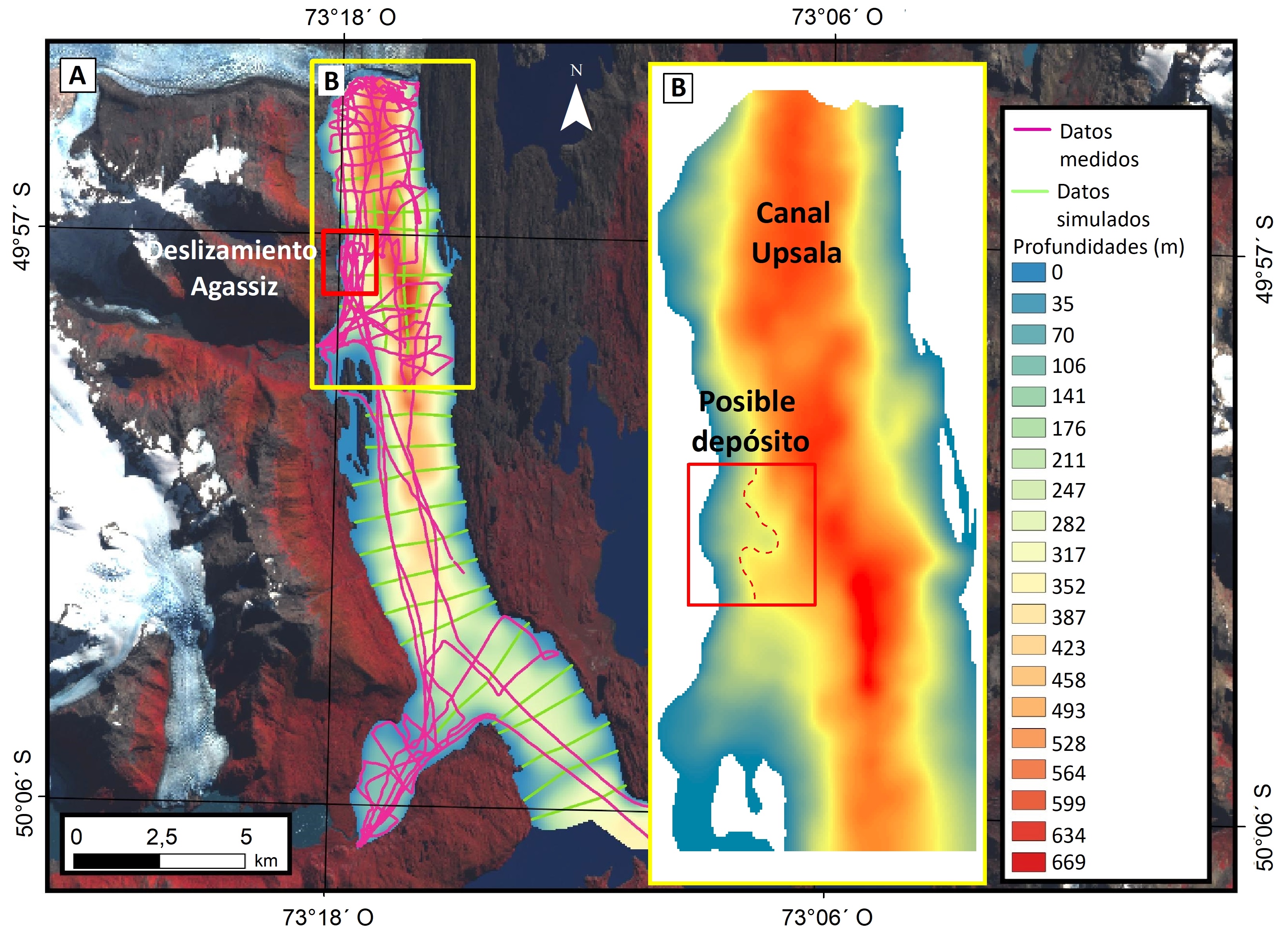 Estudios batimétricos realizados después del evento (Rivera et al., 2019) arrojaron indicios de la presencia del material desplazado debajo del agua. En la figura 5A, se muestran las mediciones realizadas y como resultado en el mapa de profundidades (en metros) se denota, en la zona del evento, un depósito bajo el agua de forma lobular direccionado hacia el sureste del canal (ver recuadro color rojo), probablemente levemente desviado por las corrientes de agua (Fig. 5B). En cuanto a las profundidades del lecho, se destaca que la zona del deslizamiento bajo el agua presenta valores cercanos a los ~150 m, comparado con las profundidades de las zonas que la circundan (300 m). Esta disminución de la profundidad del canal indicaría la presencia del posible depósito subacuático originado. En función de los datos provistos por el sonar y el modelo digital de profundidades, se efectuaron cálculos del volumen del depósito y se estimó un rango posible entre 0,07 y 0,13 km3 aproximadamente. Cabe destacar que la batimetría fue realizada tres años después de la ocurrencia del evento; por ello, los datos registrados por el sonar posiblemente son aquellos que presentan una granulometría más gruesa, el material más fino es probable que haya sido erosionado por las corrientes de agua del lago Argentino y que se encuentre en su fondo de manera estratificada.