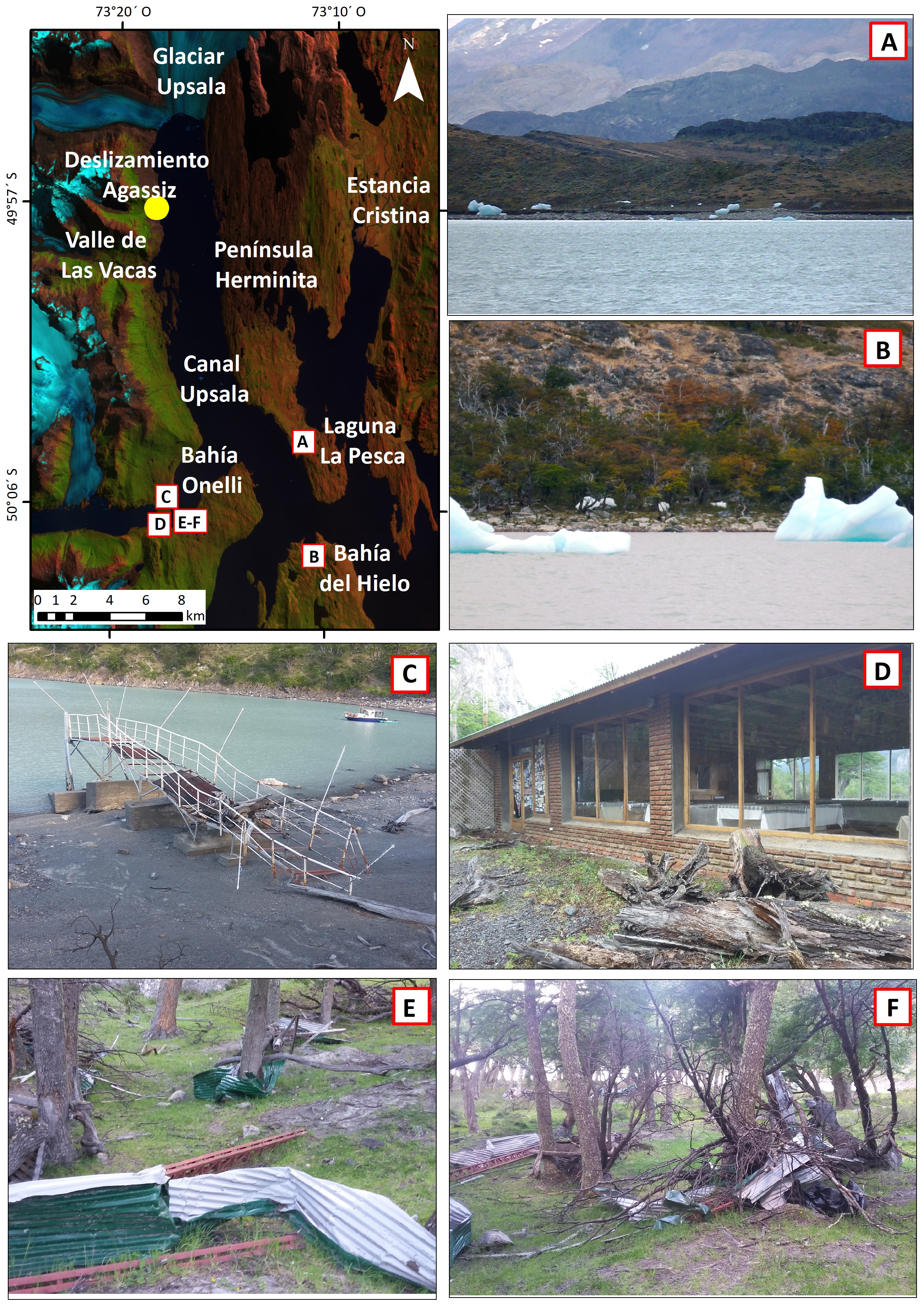 El tsunami generado por el deslizamiento se evidenció sobre las costas del valle de Las Vacas y la bahía Onelli (Fig. 6A-F), en ambas zonas se depositaron troncos de los árboles del bosque de Nothofagus provenientes de la zona superior de la ladera deslizada. Al llegar a la bahía Onelli, se observaron destrozos sobre el muelle, témpanos montados en las laderas y remoción de material de la ladera debido al tsunami. Los impactos ocasionados se visualizaron hasta la bahía del Hielo a 20,3 km hacia el sur del canal, donde témpanos provenientes del glaciar Upsala quedaron introducidos en un pequeño bosque de ñire (Fig. 6B). Además, se depositaron témpanos de dimensiones métricas sobre la península Herminita y la laguna La Pesca (Fig. 6A). Por otro lado, desde la estancia Cristina, se relató que la noche del evento el agua del lago se retrajo en la costa, y se escuchó un gran estruendo que pudo ser asociado al desprendimiento de la ladera. Sin embargo, al estar estancia Cristina alejada del canal (Fig. 6), los residentes temporarios no advirtieron el tsunami producido.