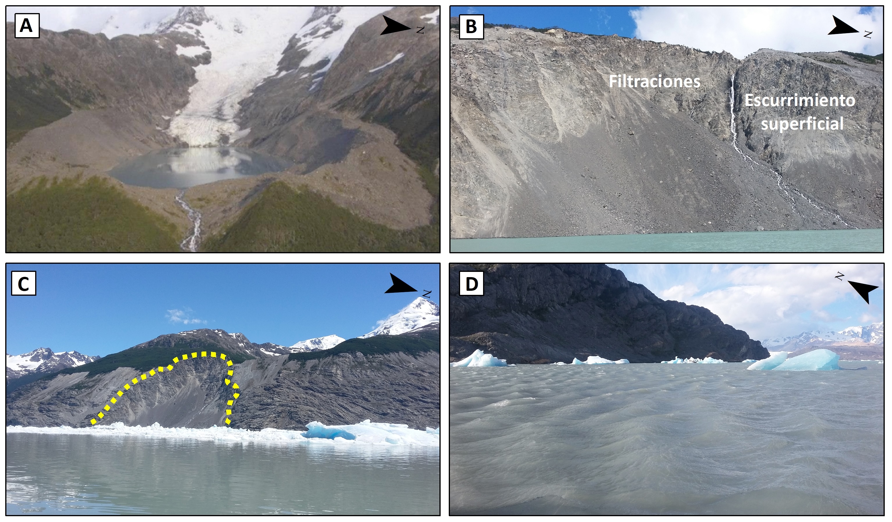 Si bien el/los factores desencadenantes del evento Agassiz se desconocen, debe considerarse que la zona es afectada por intensas precipitaciones provenientes del oeste (Villalba et al., 2017) y es sísmicamente activa (Adaros, 2003). Como ocurre en diversas partes del mundo, eventos meteorológicos con precipitaciones intensas pueden inducir a la ocurrencia de procesos de remoción en masa (e.g., Segoni et al., 2018; Lauro et al., 2017; Hong et al., 2017; Peruccacci et al., 2017). En los ambientes paraglaciales, después del retroceso del glaciar, las elevadas precipitaciones inducen procesos de remoción en masa, desplazando los sedimentos de las laderas hacia el fondo del valle proglacial (Cody et al., 2020). Sin embargo, en el área del canal Upsala de acuerdo con la información disponible, no hubo reportes sobre el desarrollo de eventos meteorológicos extremos en la fecha que se generó el deslizamiento Agassiz. Es necesario señalar que la estación meteorológica más cercana al área, del lado argentino, es la de Lago Argentino Aero, actualmente llamada El Calafate Aero; aquí existen registros desde 1959 hasta 2010 (Servicio Meteorológico Nacional-www.smn.gov.ar). Además, del lado chileno se encuentra la estación meteorológica de Torres del Paine, que comenzó a operar a partir del año 2016. Es decir, ambas estaciones dejan fuera la posibilidad de tener datos para el año de ocurrencia del deslizamiento. Esto condiciona la posibilidad de efectuar un análisis exhaustivo para corroborar si fuertes precipitaciones fueron responsables de gatillar el deslizamiento. Tal como se señaló anteriormente, la ladera oeste del canal, en el lugar donde ocurrió el deslizamiento, presenta un importante aporte de agua proveniente de la laguna proglacial Agassiz represada por una morrena lateral (Fig. 8A). Esta se ubica a 780 m s.n.m., inmediatamente al oeste de la ladera del canal y contribuye con el aporte de agua superficial continuo (arroyo emisario) con caudales variables a lo largo del año, la cual produce filtraciones (Fig. 8B) que saturan el material morrénico permeable de la ladera.